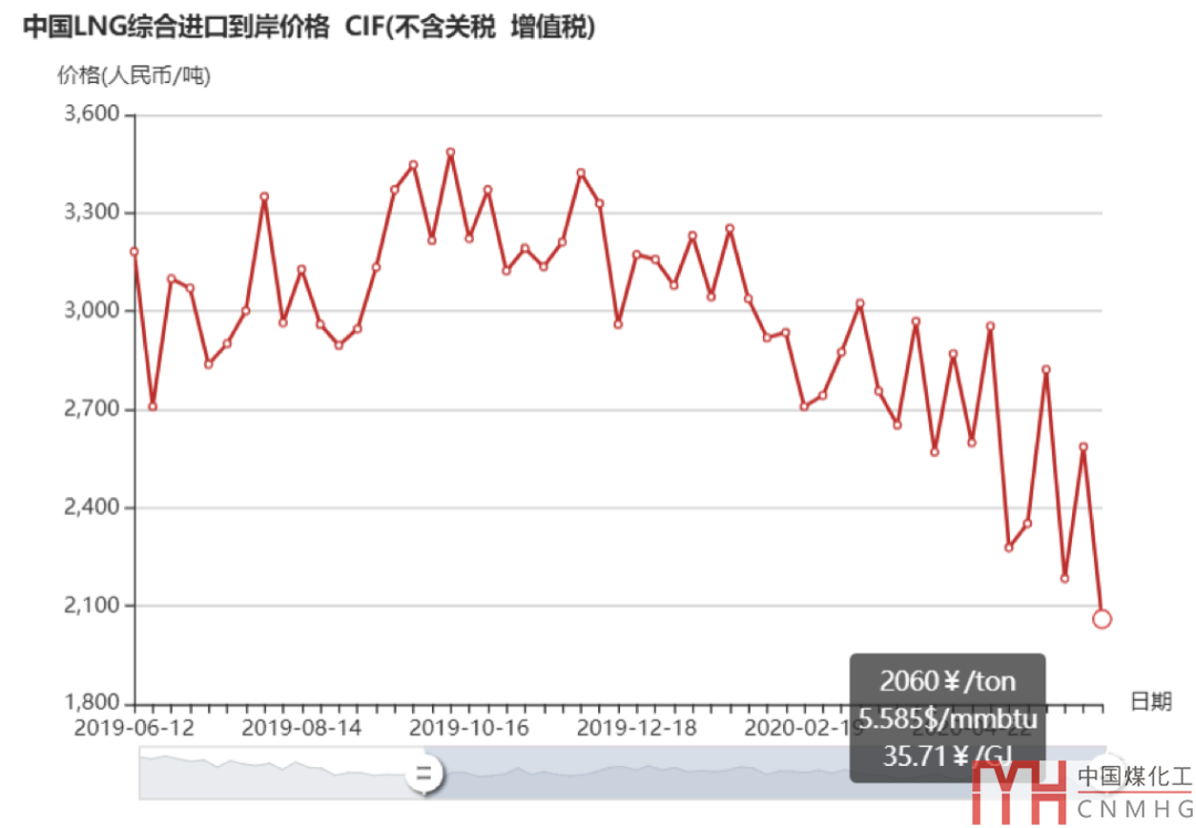 6月1日-7日中国LNG综合进口到岸价2060元/吨 周降幅逾20%