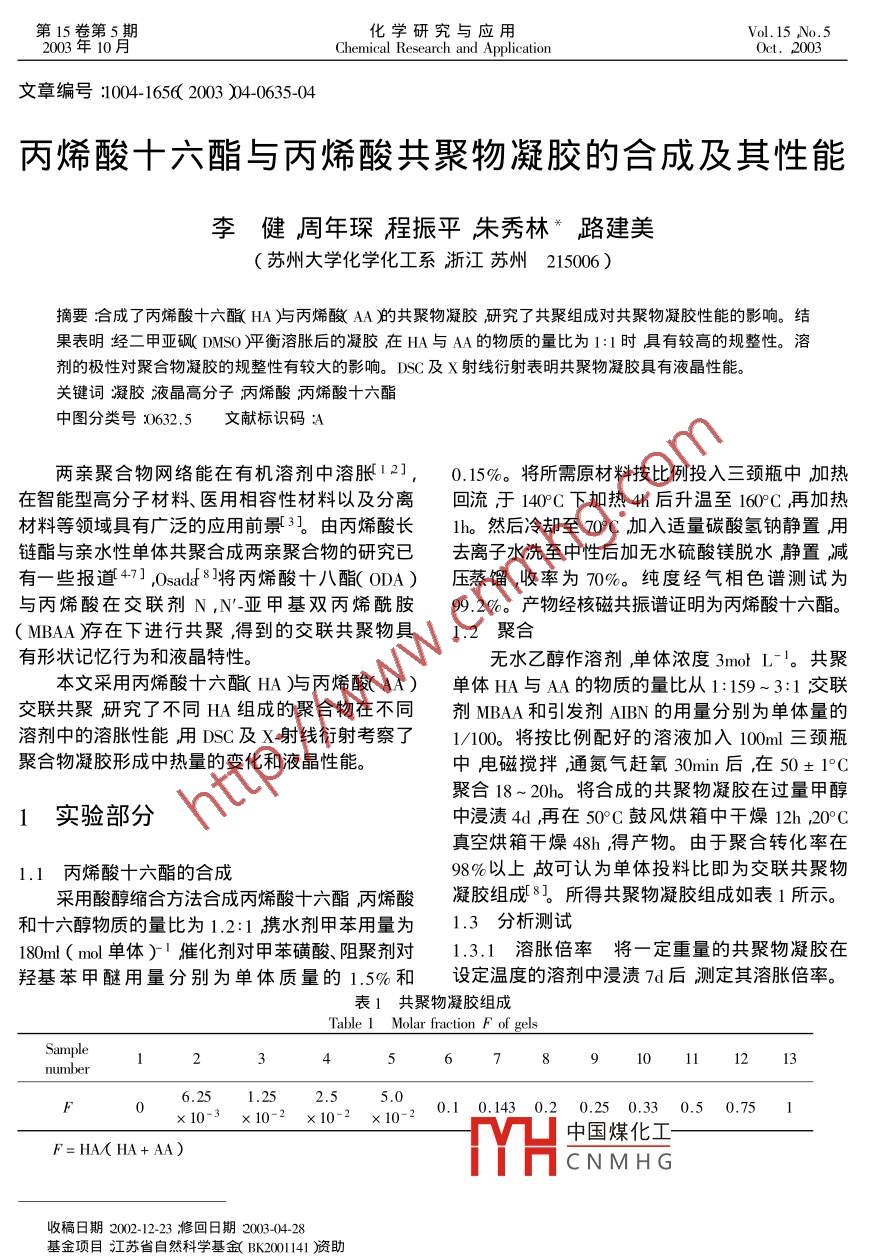 丙烯酸十六酯与丙烯酸共聚物凝胶的合成及其性能