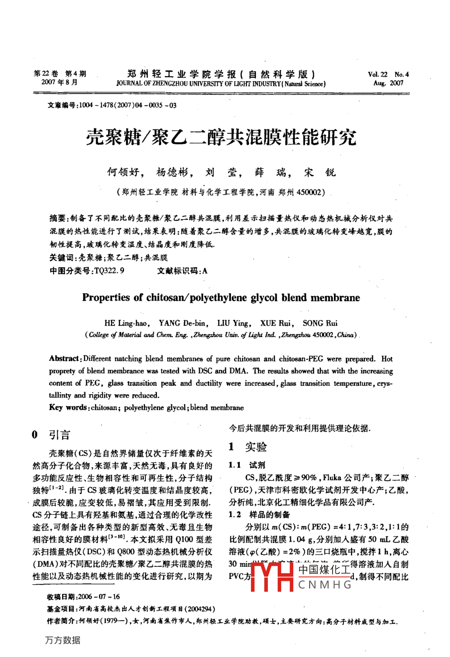 壳聚糖/聚乙二醇共混膜性能研究