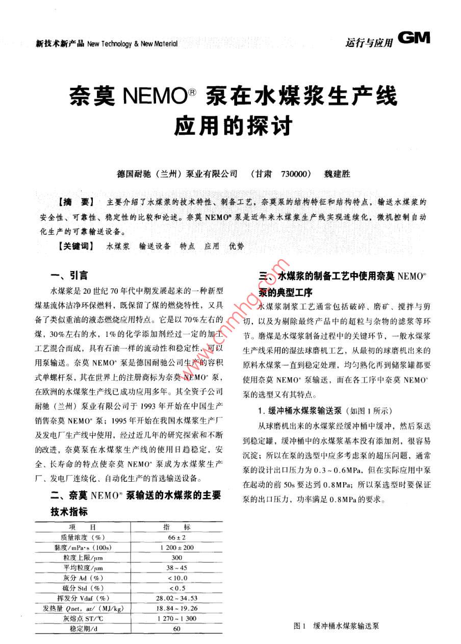 奈莫NEMO(R)泵在水煤浆生产线应用的探讨