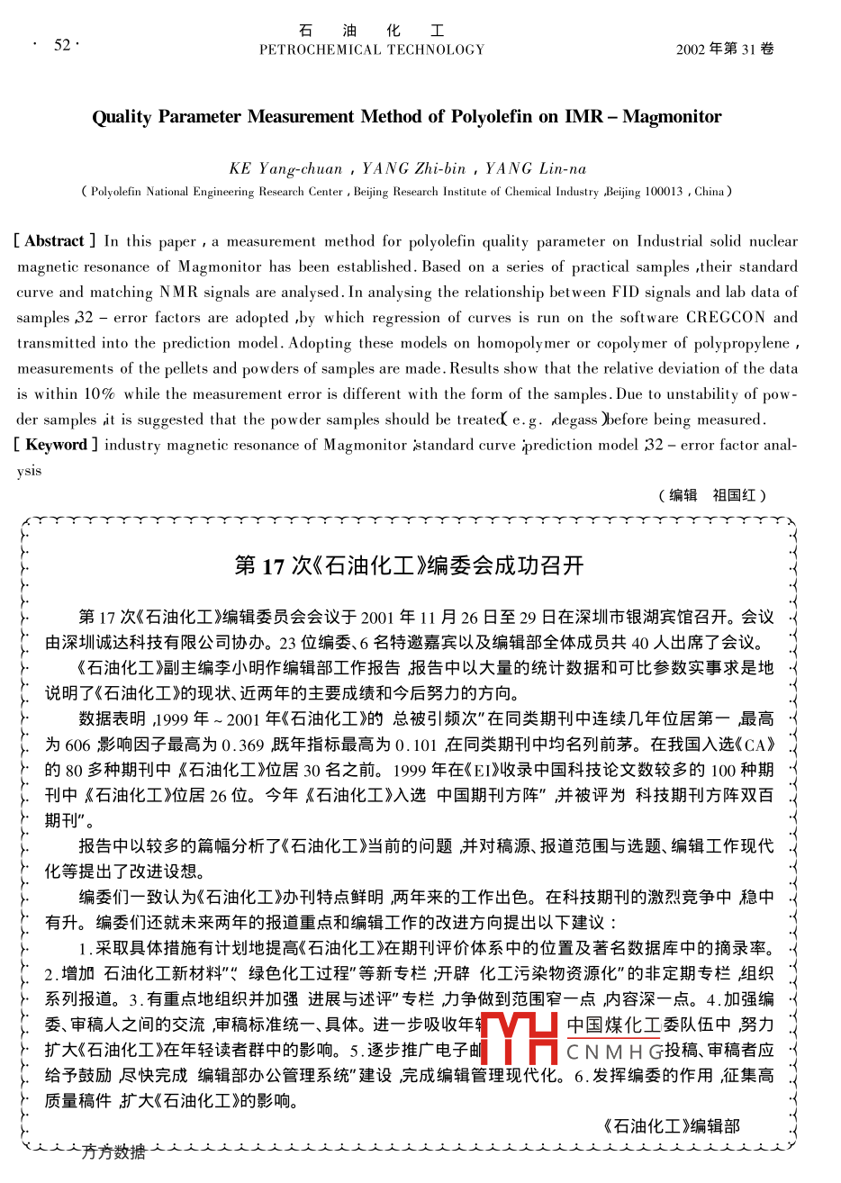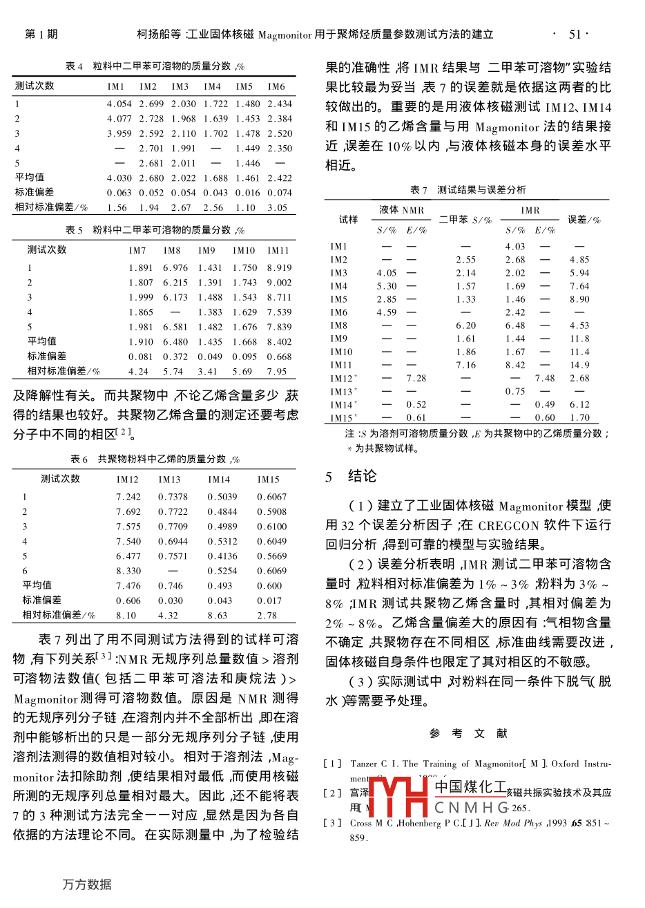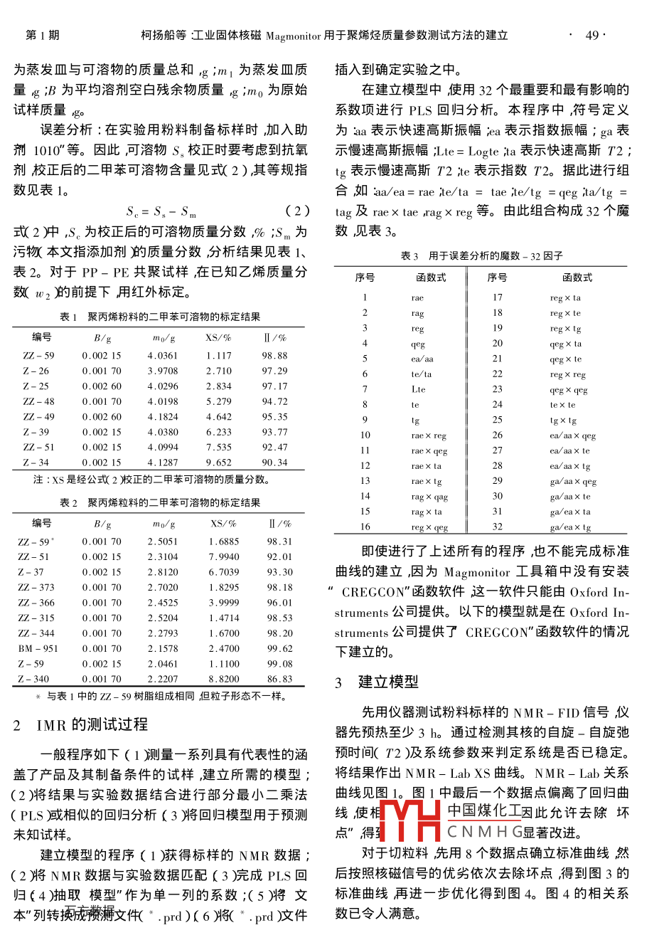工业固体核磁Magmontior用于聚烯烃质量参数测试方法的建立