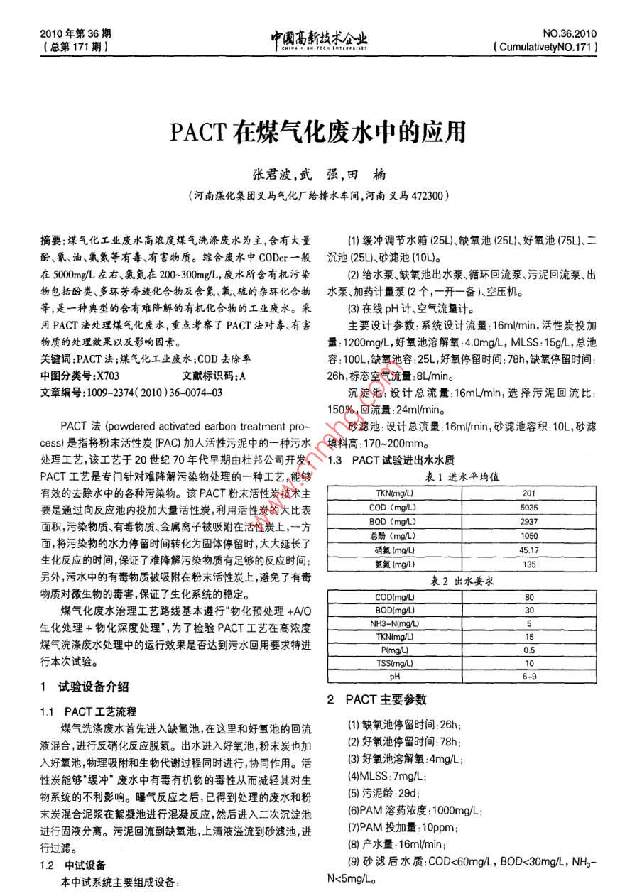 PACT在煤气化废水中的应用