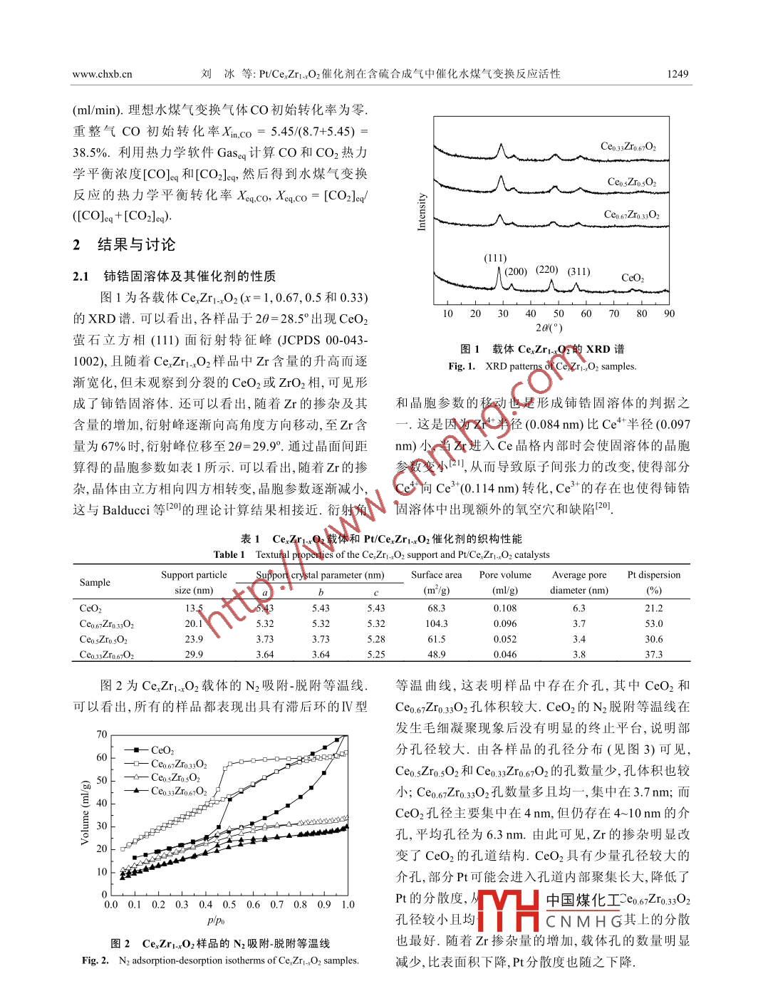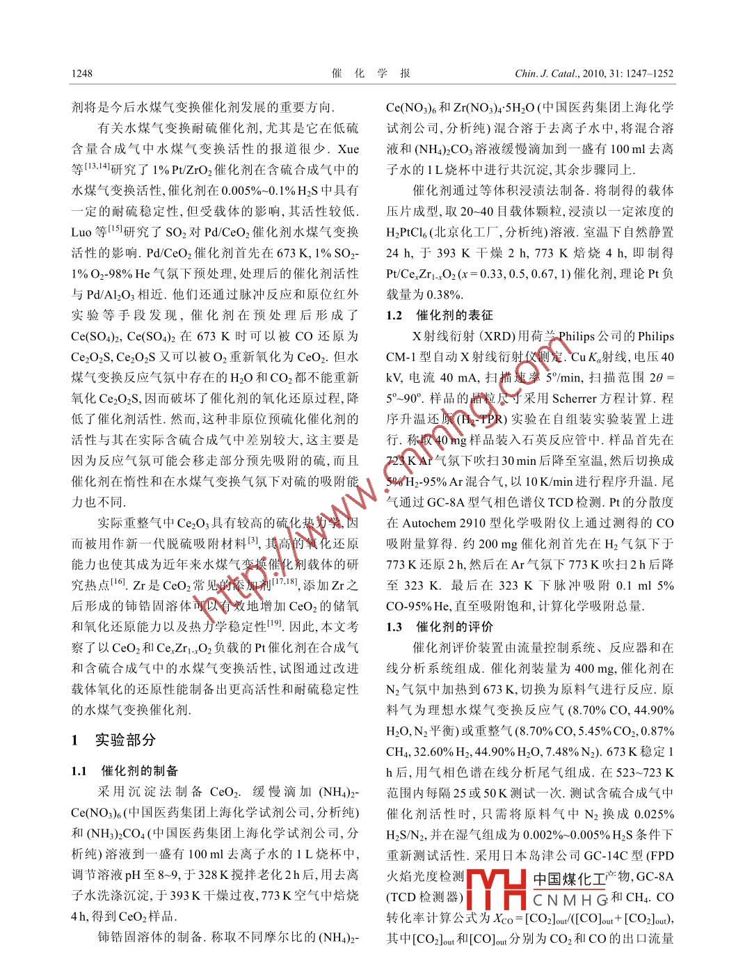 Pt/CexZr1-xO2催化剂在含硫合成气中催化水煤气变换反应活性