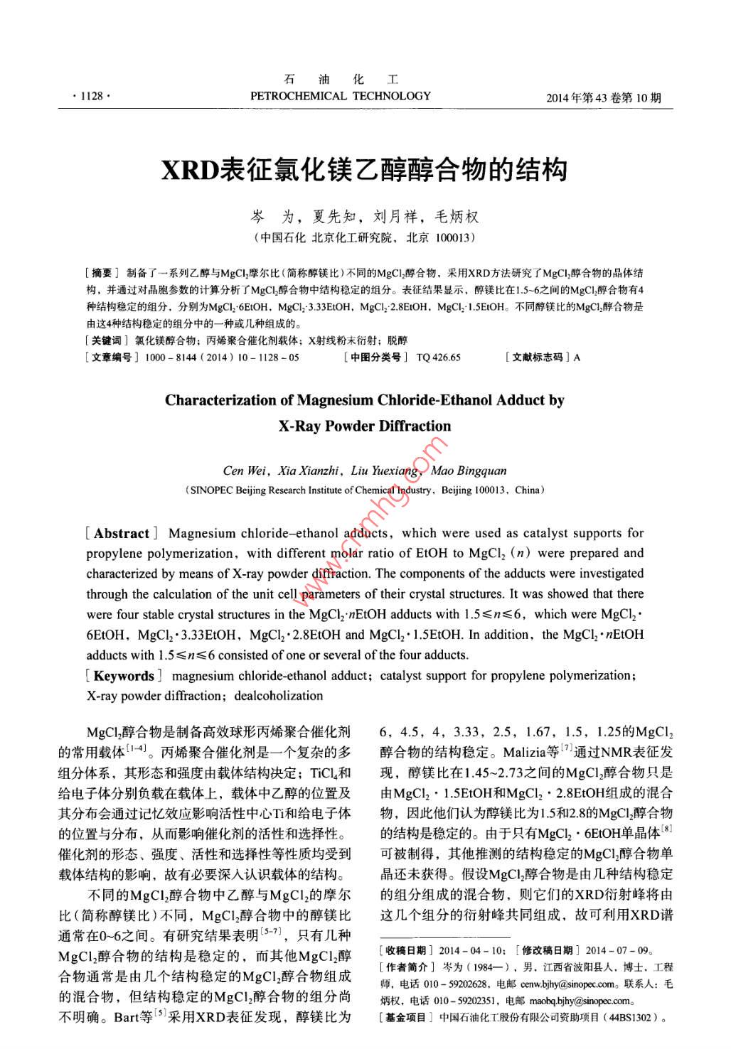 XRD表征氯化镁乙醇醇合物的结构