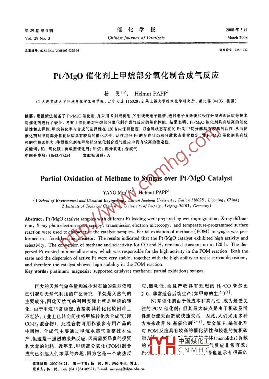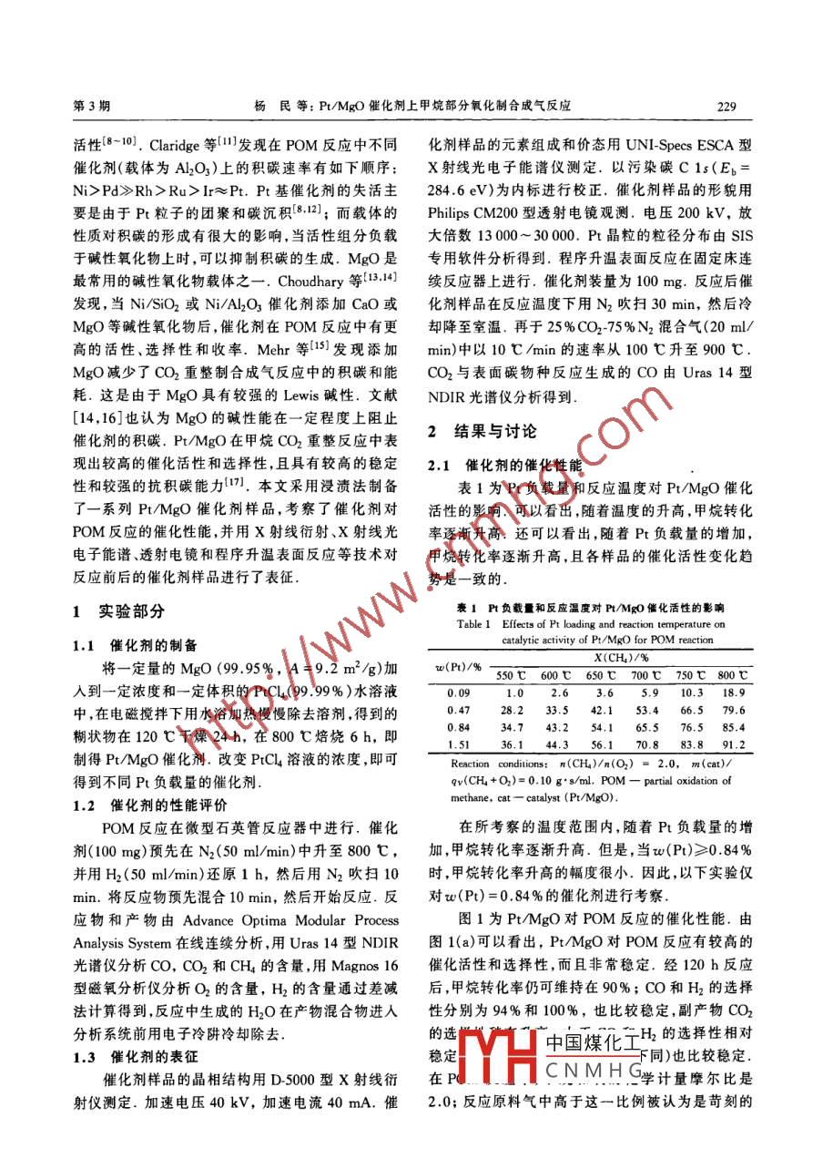 Pt/MgO 催化剂上甲烷部分氧化制合成气反应