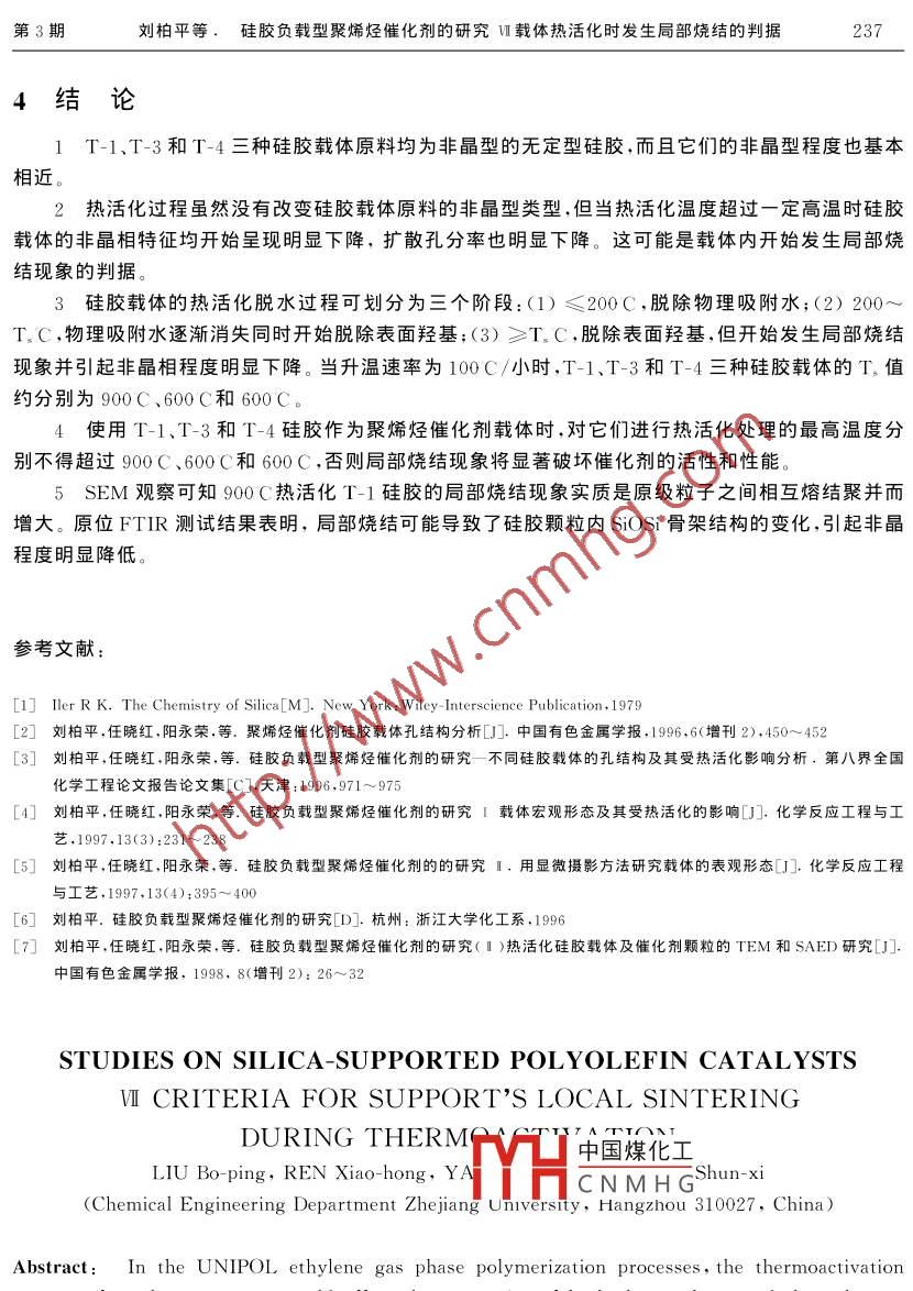 硅胶负载型聚烯烃催化剂的研究Ⅶ载体热活化时发生局部烧结的判据