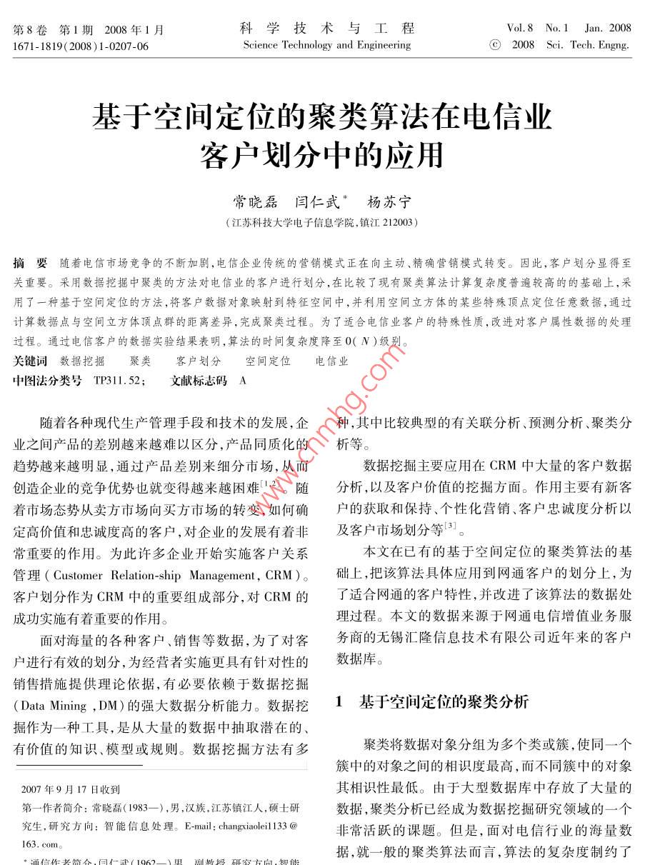 基于空问定位的聚类算法在电信业客户划分中的应用