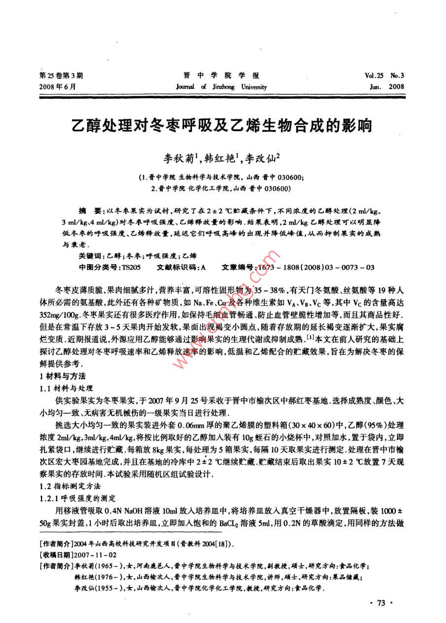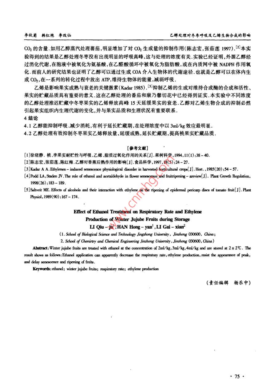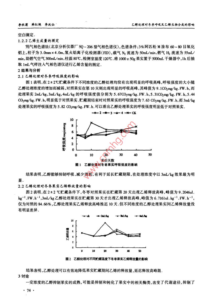 乙醇处理对冬枣呼吸及乙烯生物合成的影响