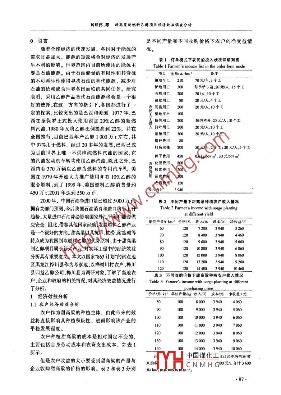 甜高梁制燃料乙醇项目经济效益调查分析——以黑龙江桦川县甜高梁制乙醇项目为例