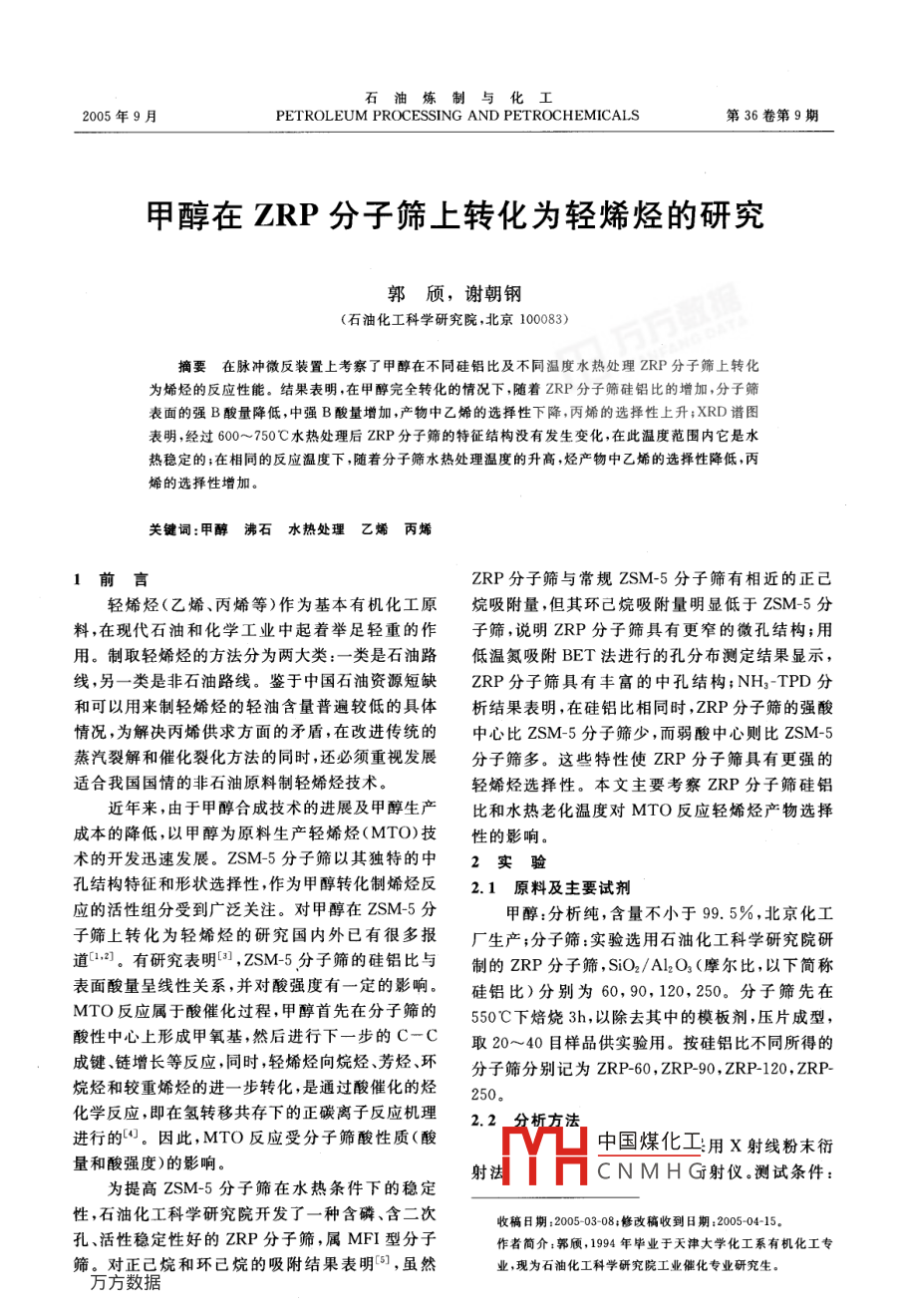 甲醇在ZRP分子筛上转化为轻烯烃的研究
