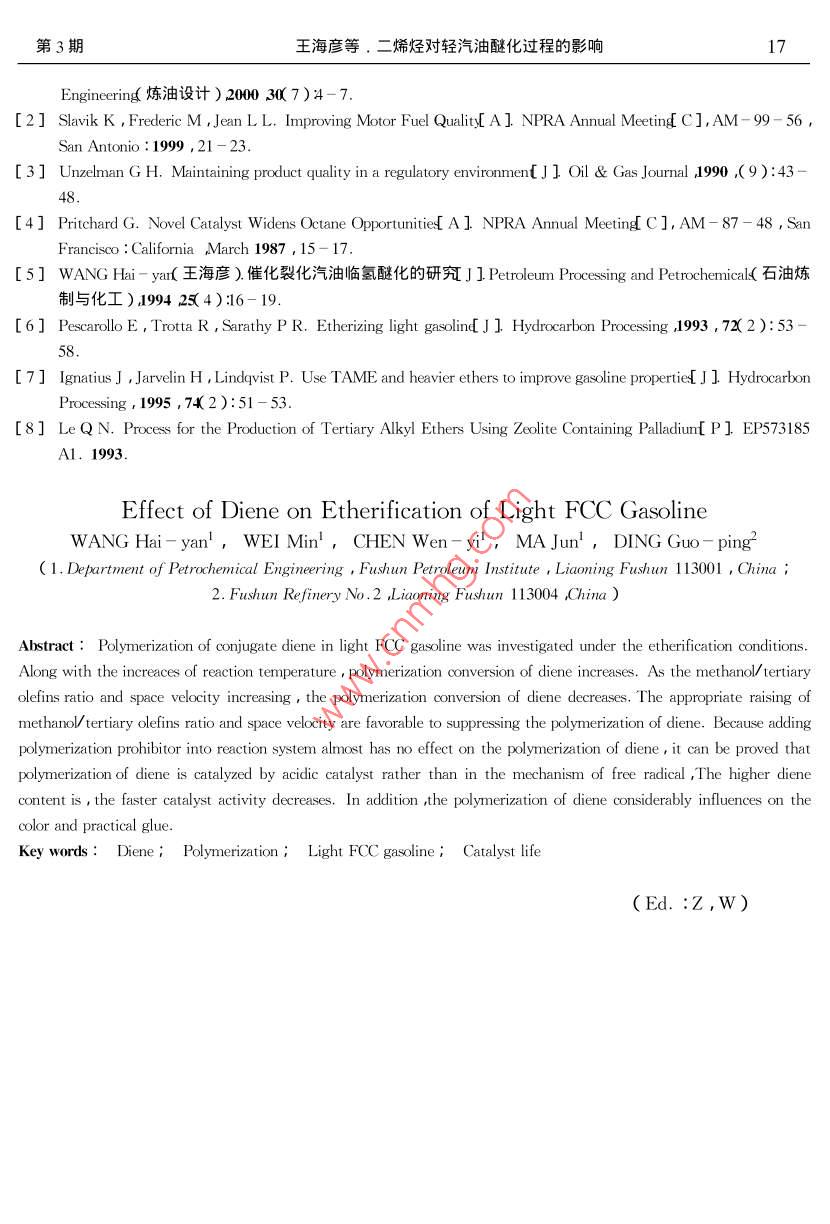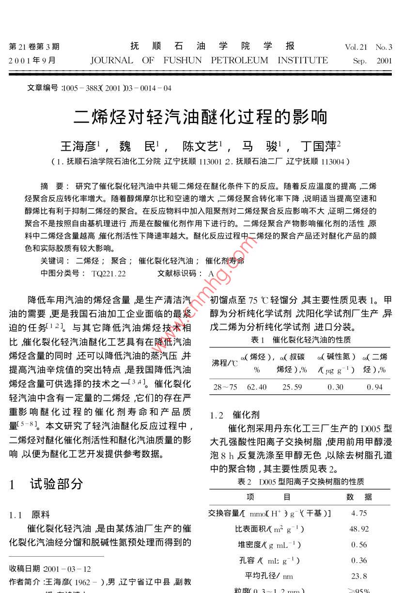 二烯烃对轻汽油醚化过程的影响