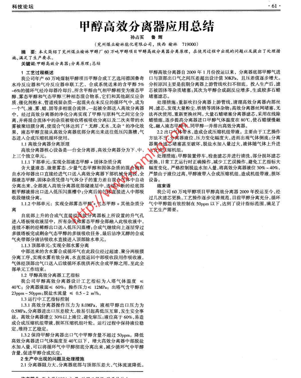 甲醇高效分离器应用总结