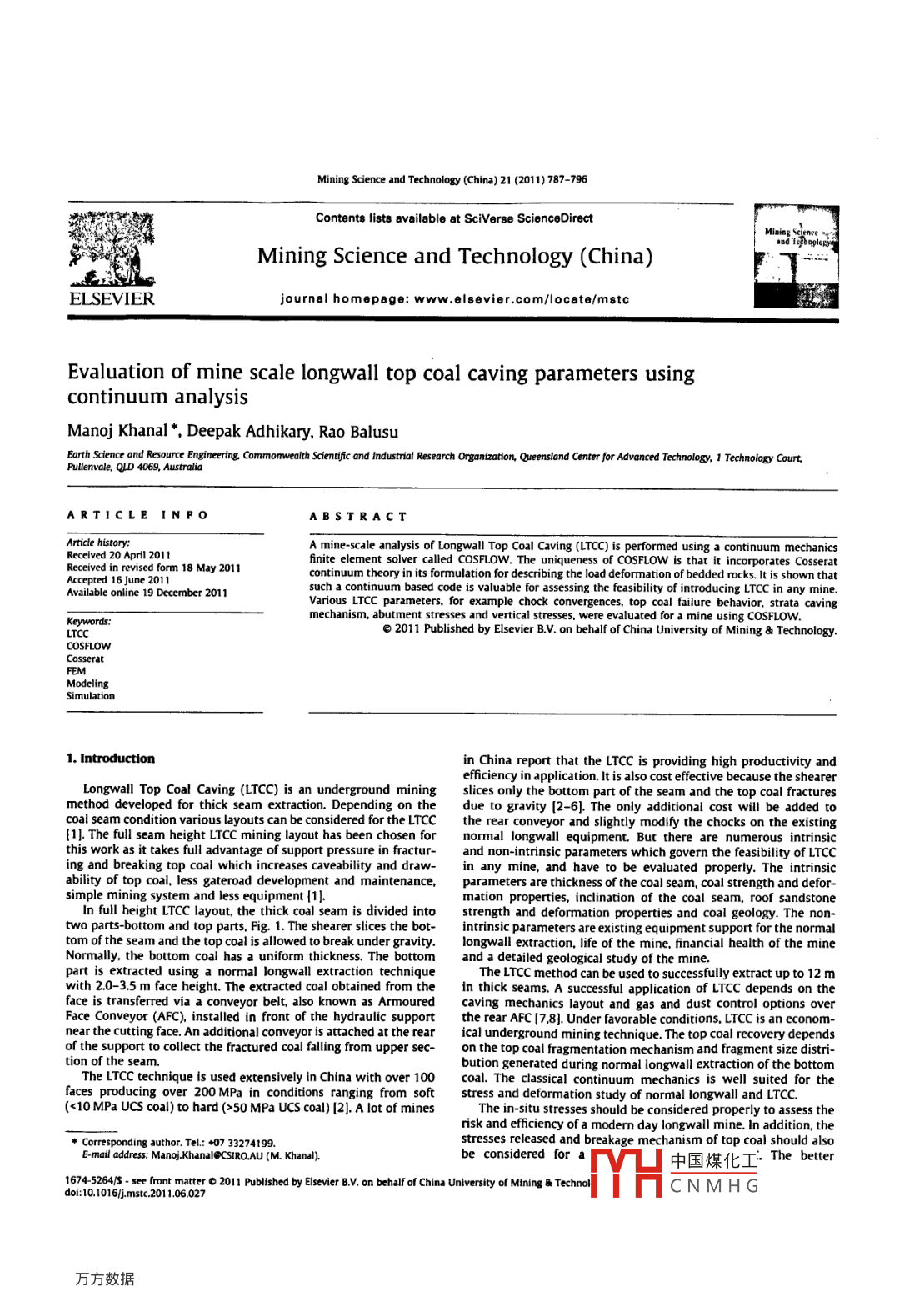 - 期刊名字:矿业科学技术(英文版)