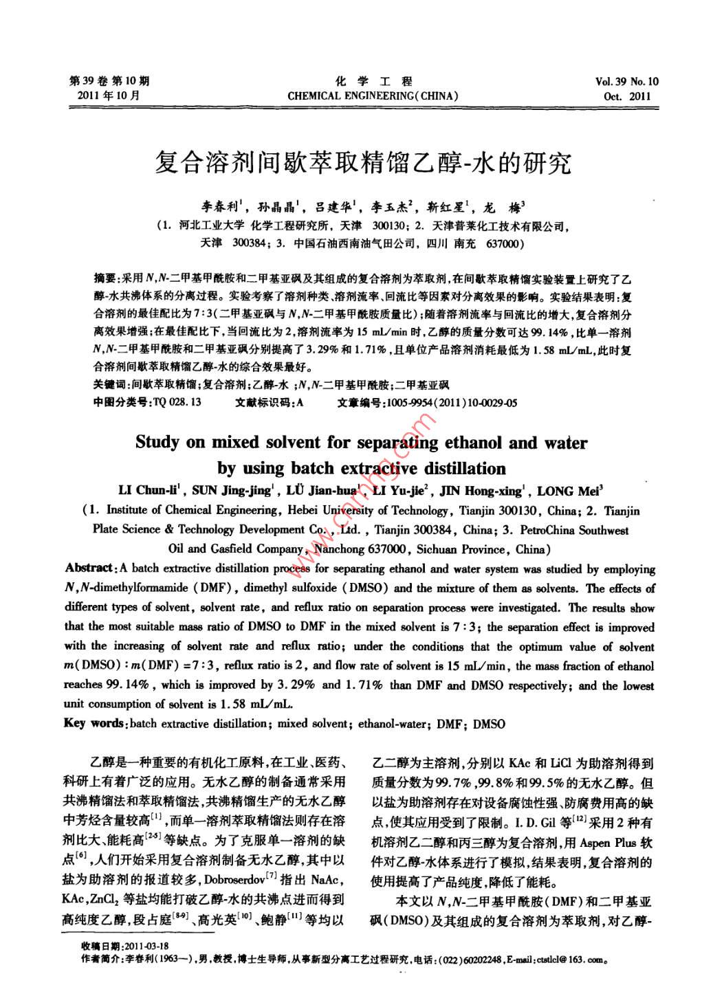 复合溶剂间歇萃取精馏乙醇-水的研究