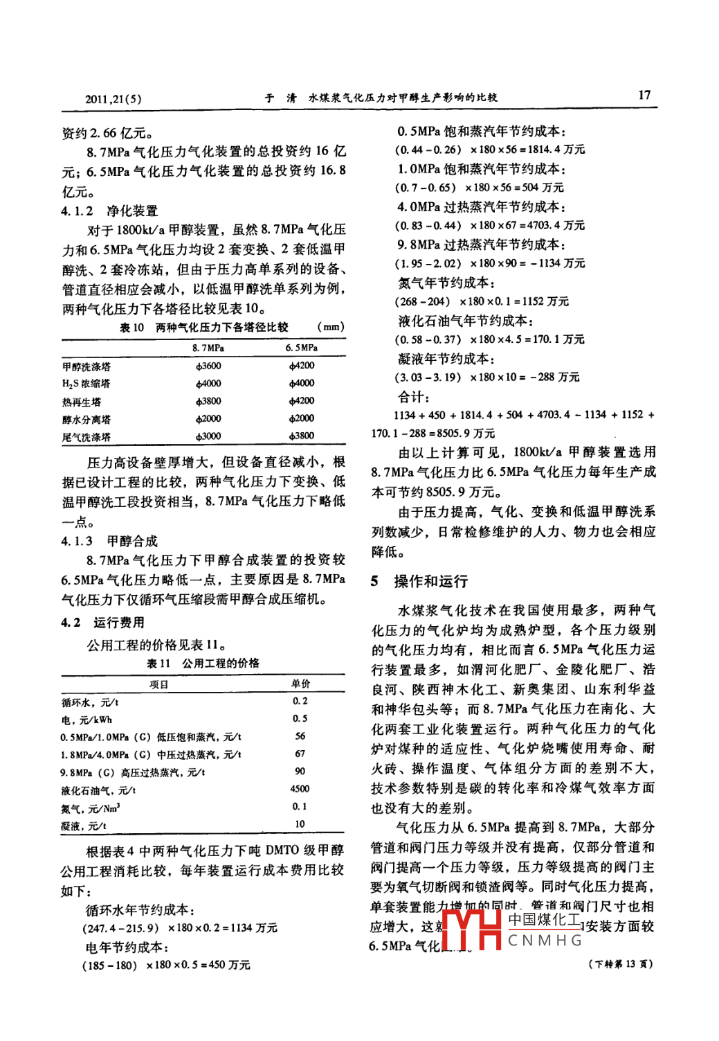 水煤浆气化压力对甲醇生产影响的比较