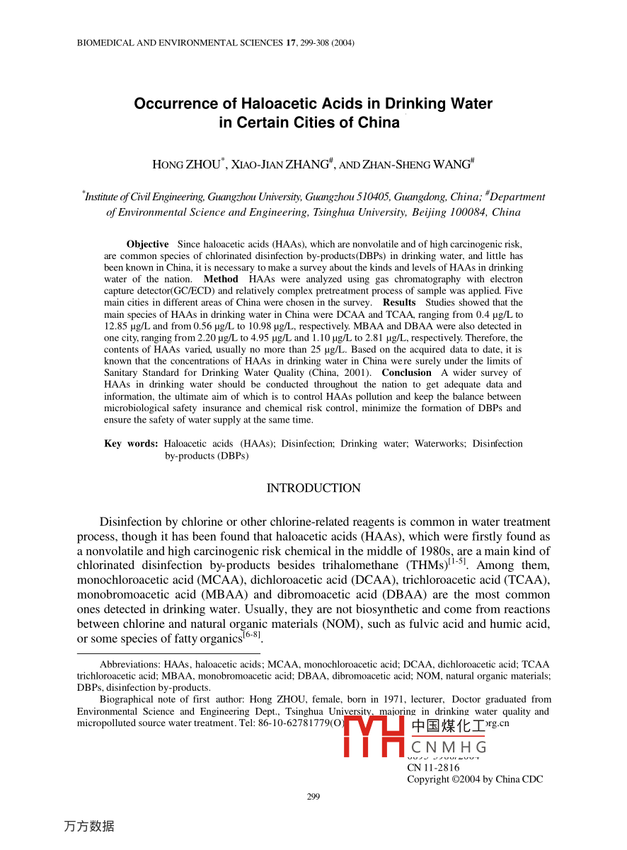 Occurrence of Haloacetic Acids in Drinking Water in Certain Cities of China