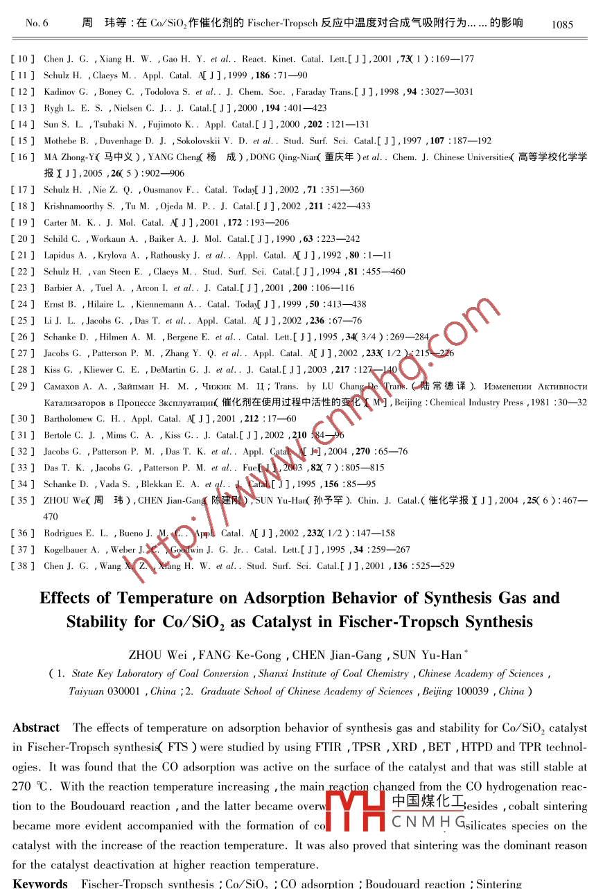在Co/SiO2作催化剂的Fischer-Tropsch反应中温度对合成气吸附行为及稳定性的影响
