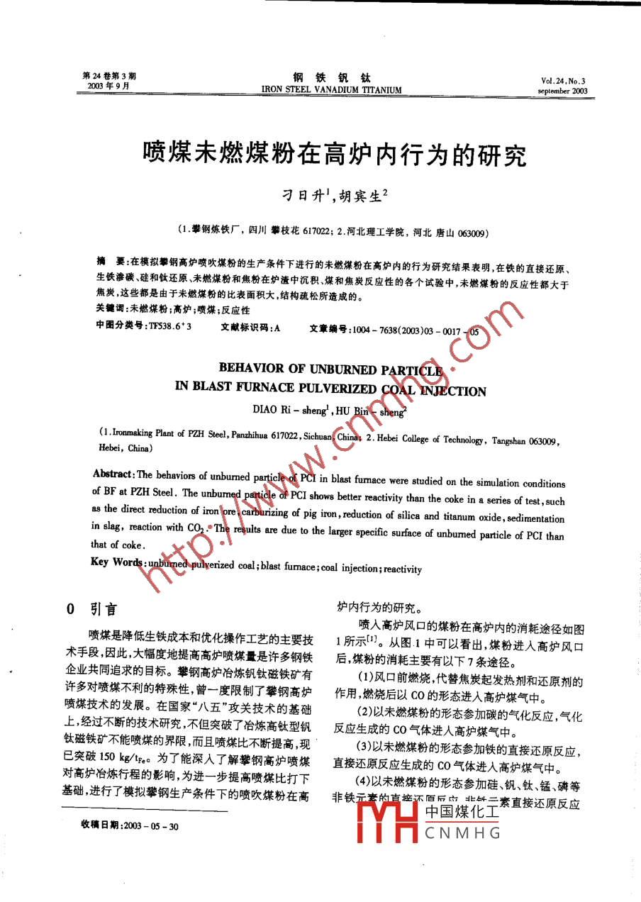 喷煤未燃煤粉在高炉内行为的研究