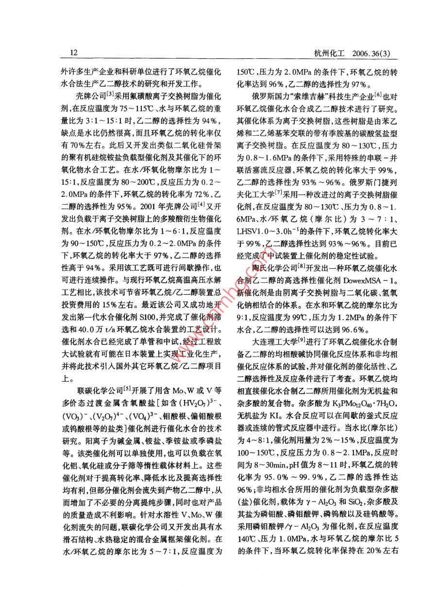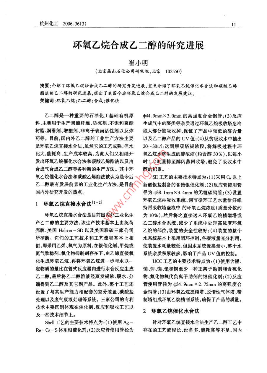 环氧乙烷合成乙二醇的研究进展