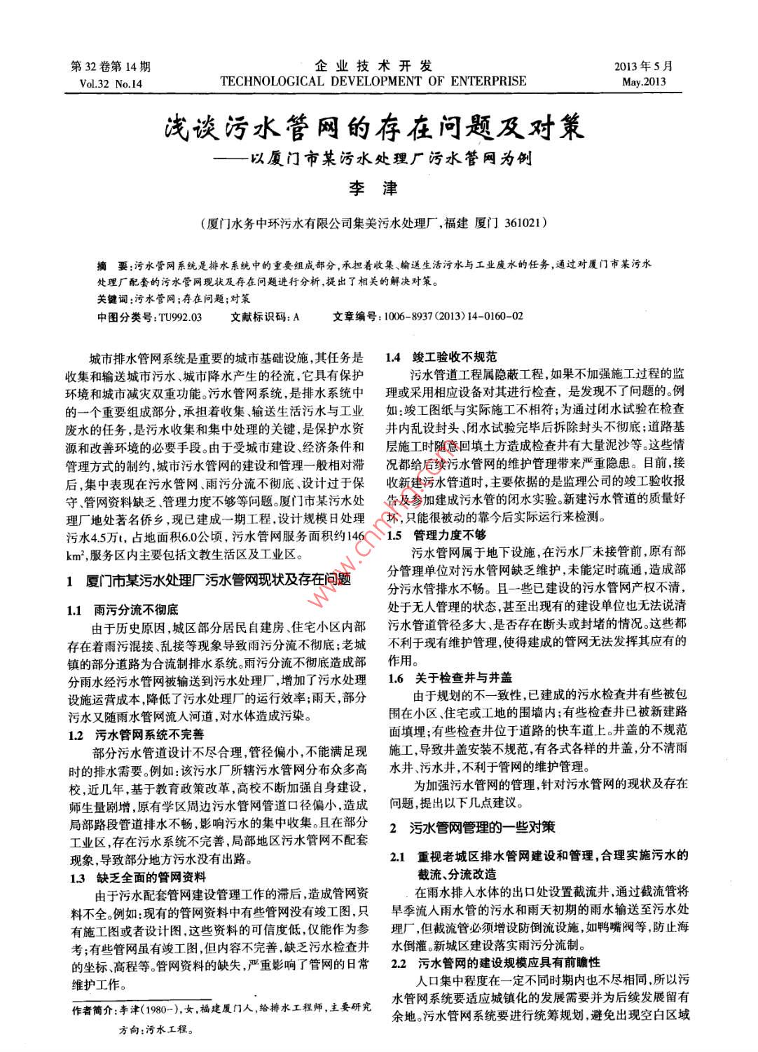 浅谈污水管网的存在问题及对策——以厦门市某污水处理厂污水管网为例
