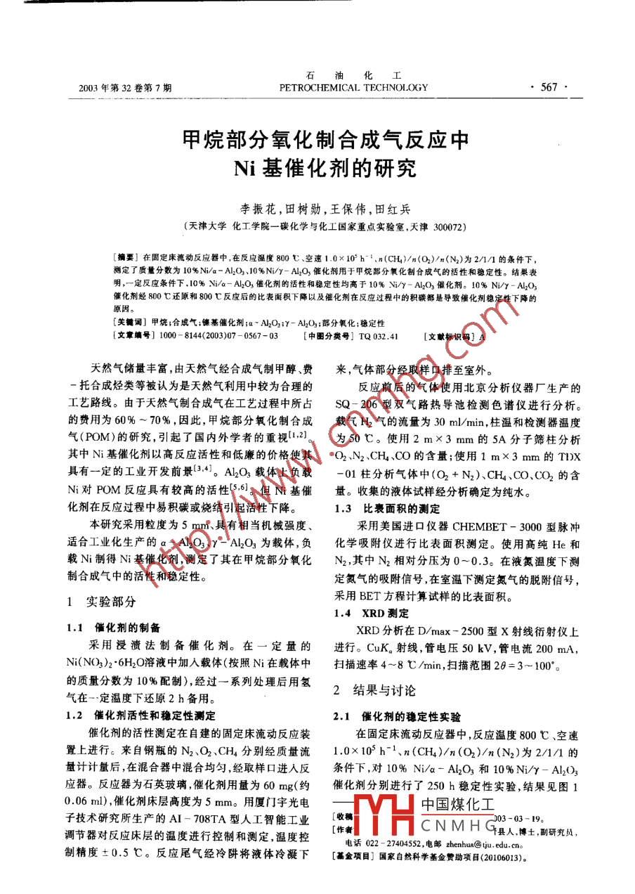 甲烷部分氧化制合成气反应中Ni基催化剂的研究