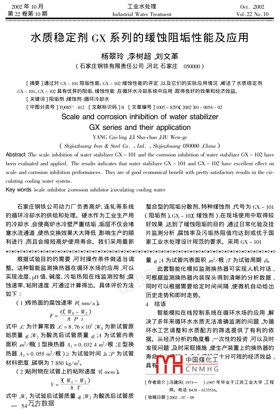 - 期刊名字:工业水处理