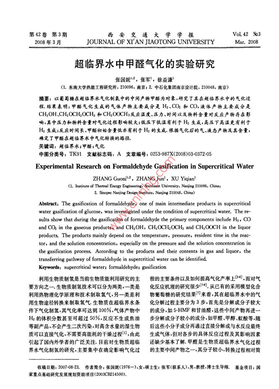 超临界水中甲醛气化的实验研究
