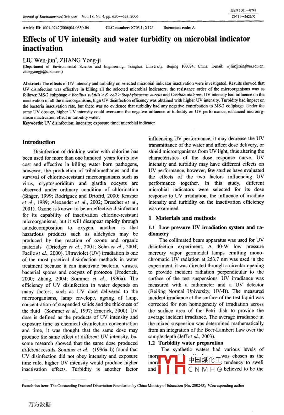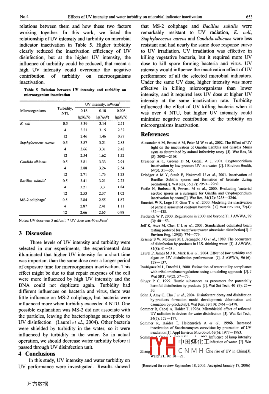 Effects of UV intensity and water turbidity on microbial indicator inactivation