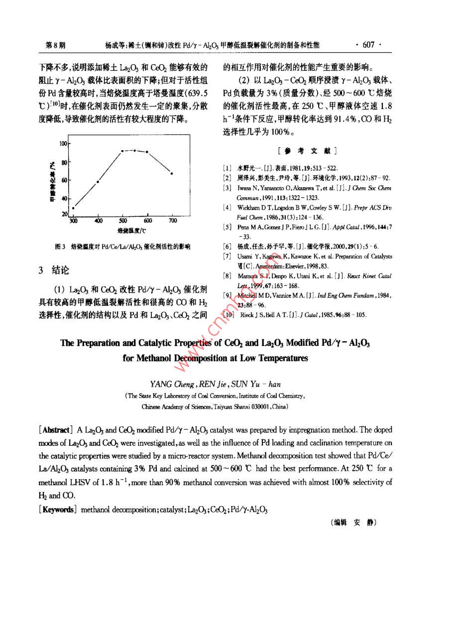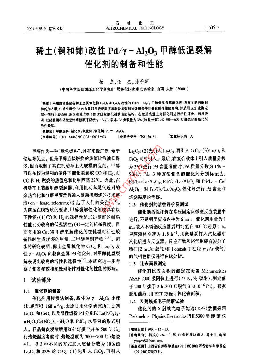 稀土(镧和铈)改性Pd/γ-Al2O3甲醇低温裂解催化剂的制备和性能