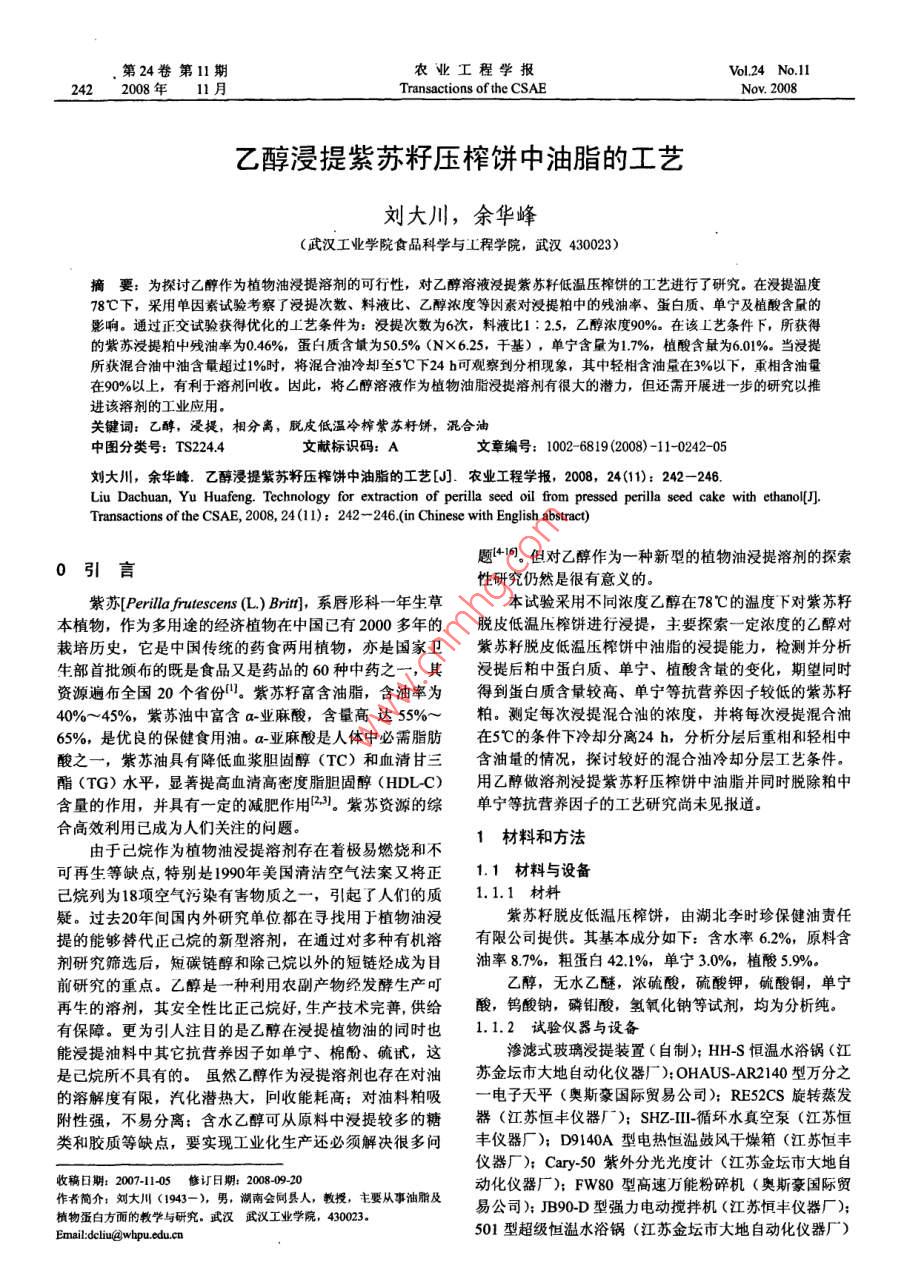 乙醇浸提紫苏籽压榨饼中油脂的工艺