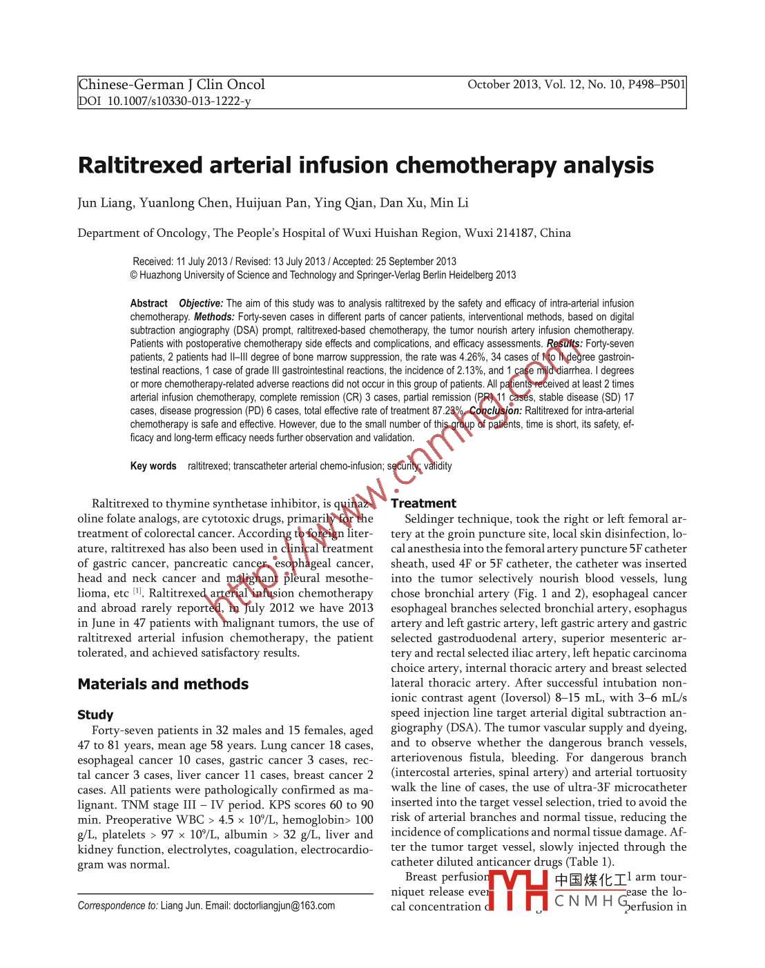 Raltitrexed arterial infusion chemotherapy analysis