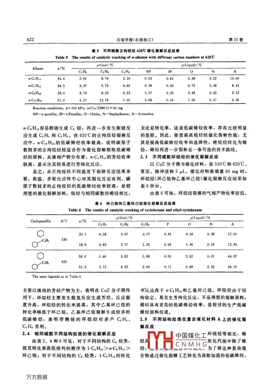 不同烃类催化裂解生产低碳烯烃的性能