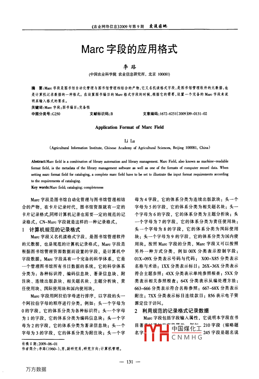 - 期刊名字:农业网络信息