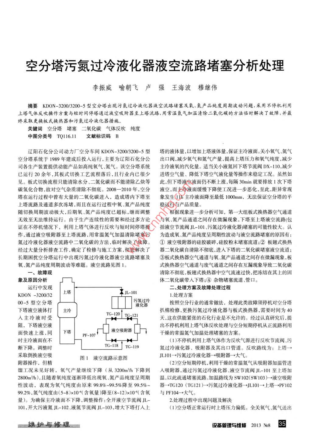 空分塔污氮过冷液化器液空流路堵塞分析处理