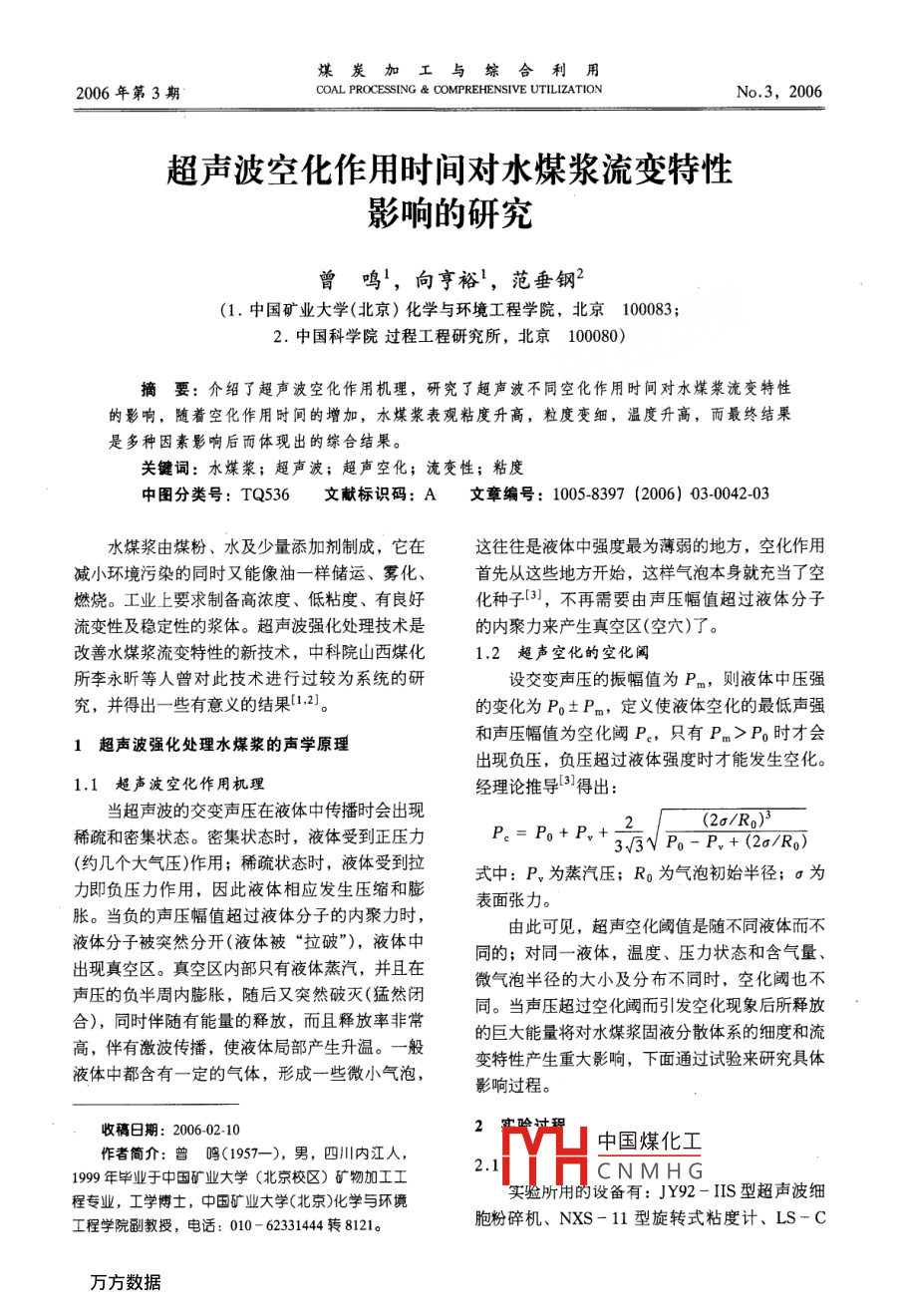 超声波空化作用时间对水煤浆流变特性影响的研究