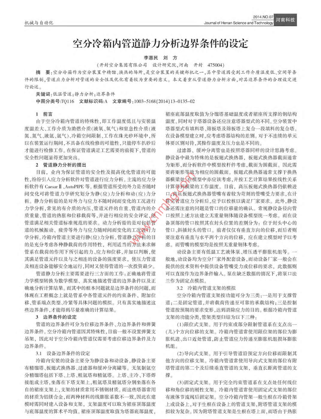 空分冷箱内管道静力分析边界条件的设定