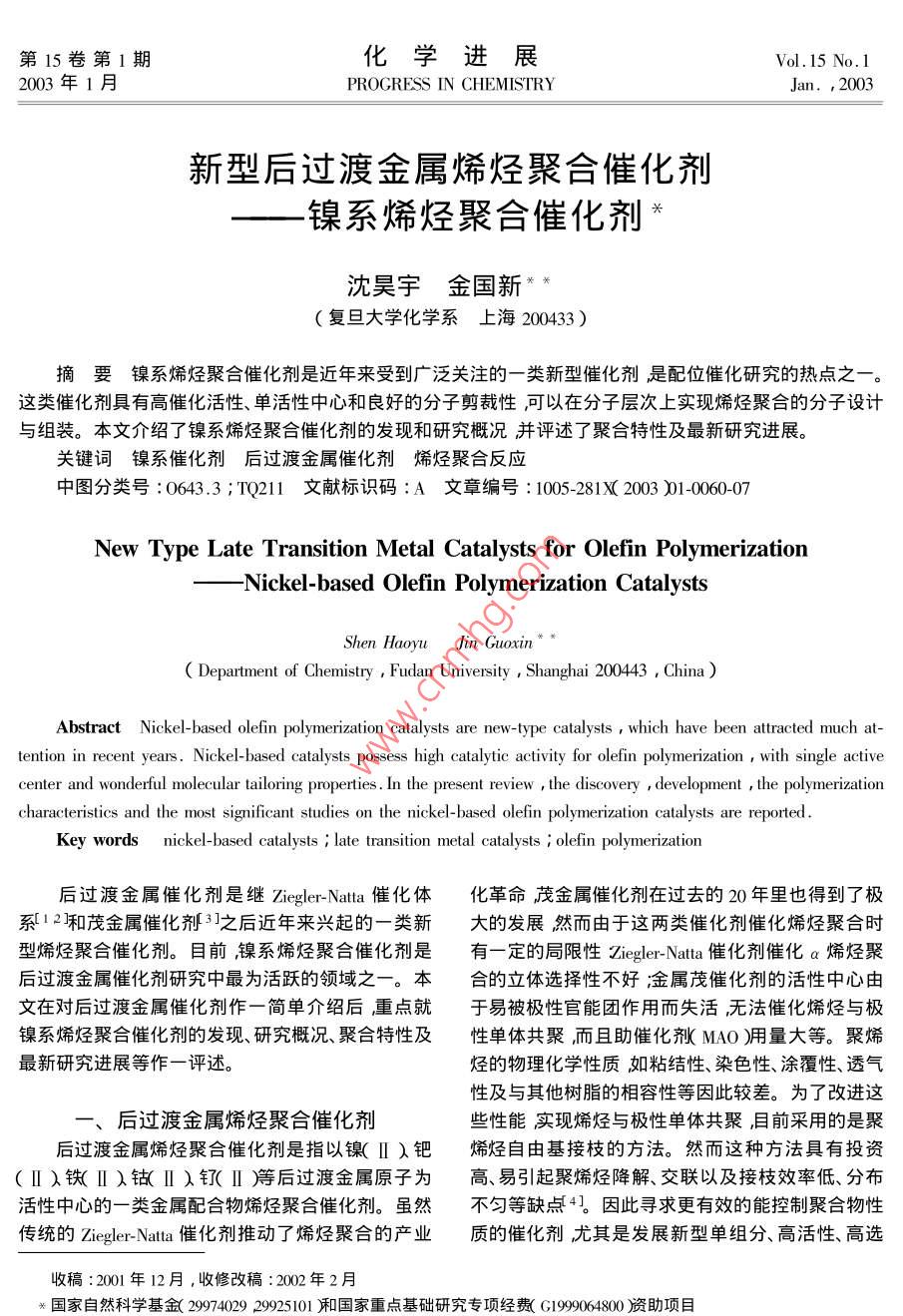 新型后过渡金属烯烃聚合催化剂--镍系烯烃聚合催化剂
