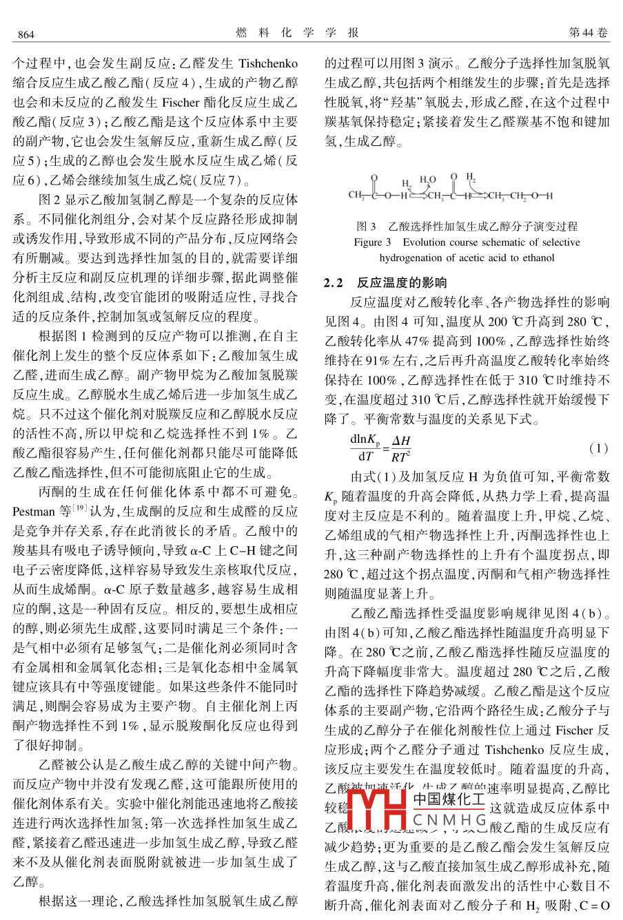 乙酸选择性加氢制乙醇反应性能研究