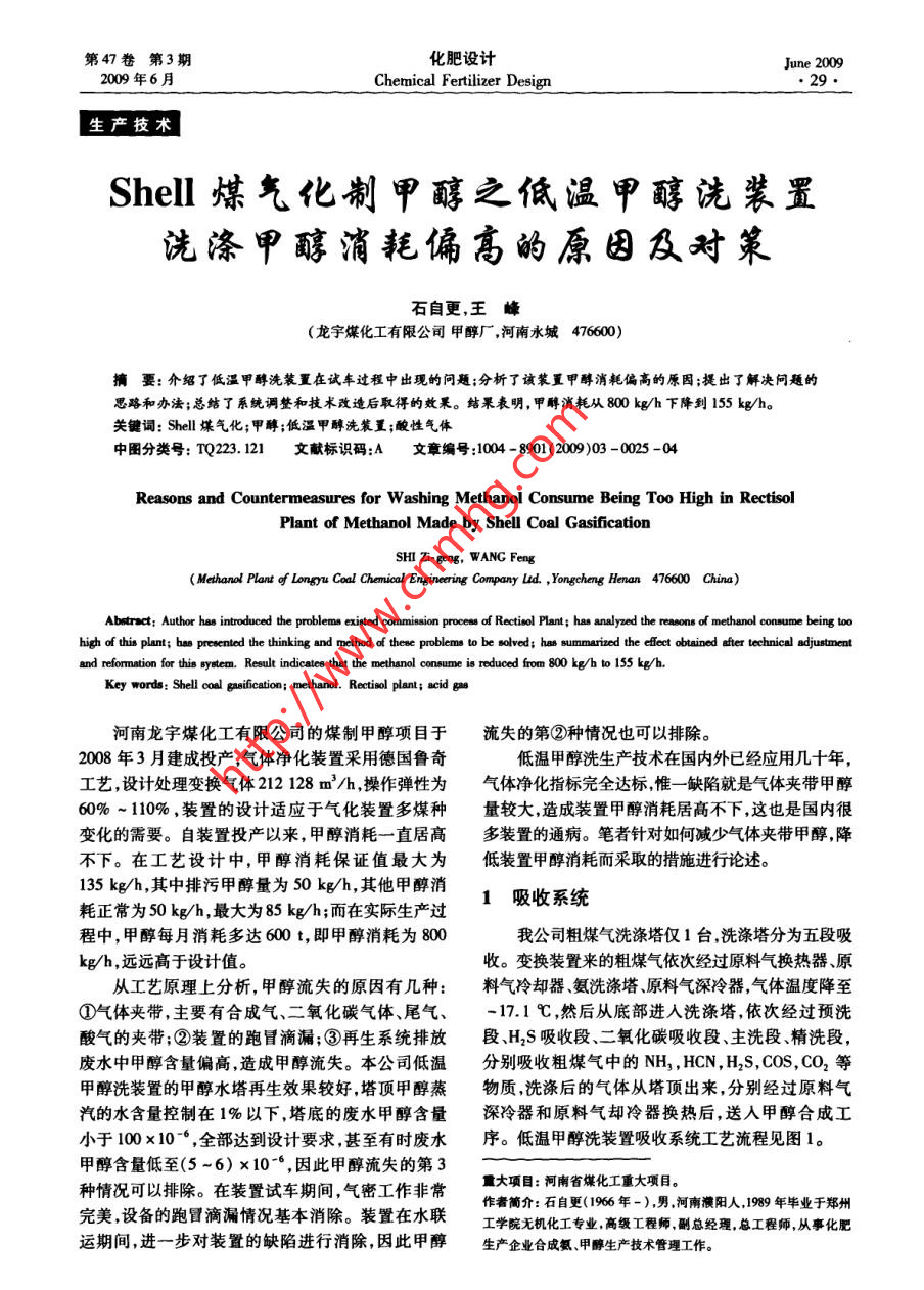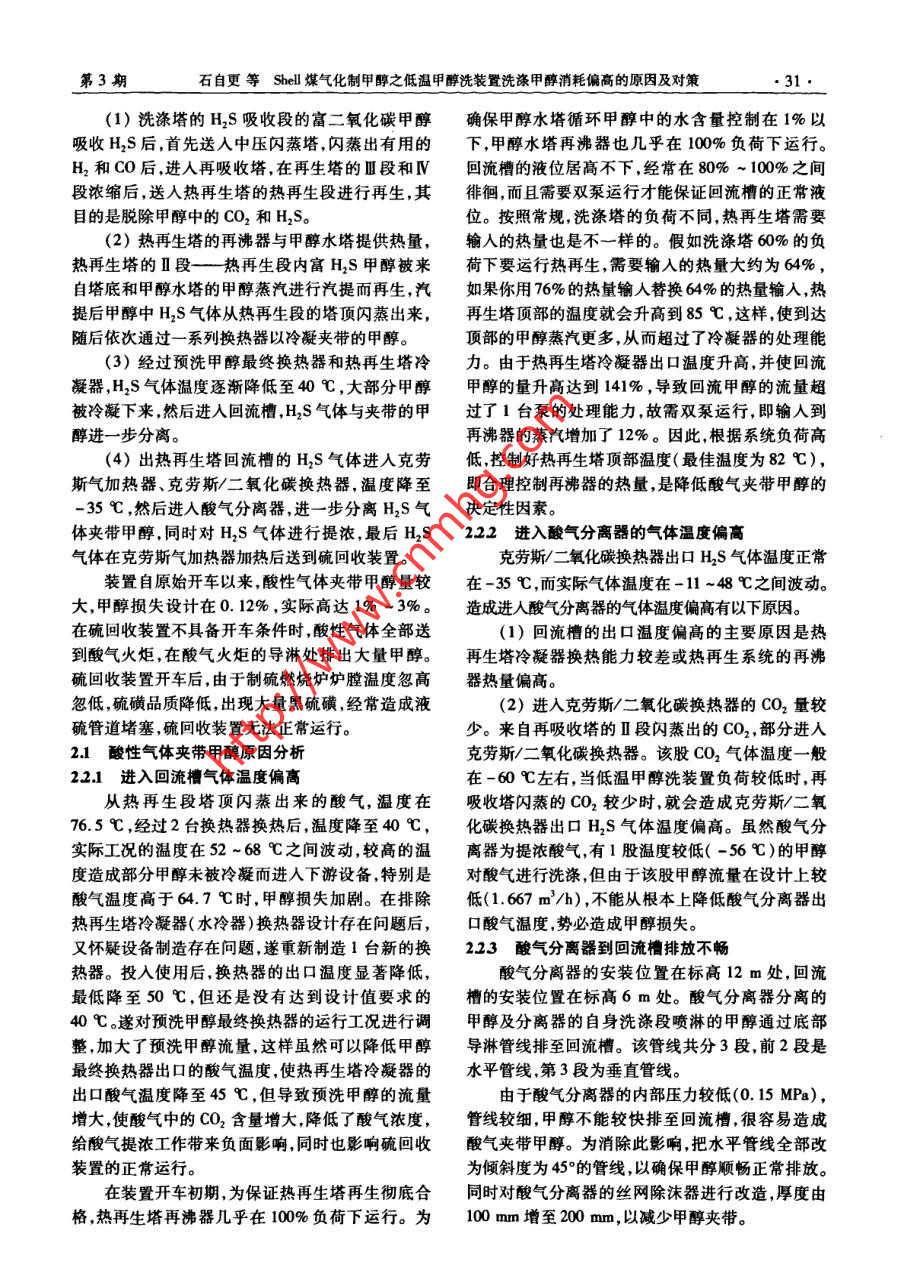 Shell煤气化制甲醇之低温甲醇洗装置洗涤甲醇消耗偏高的原因及对策