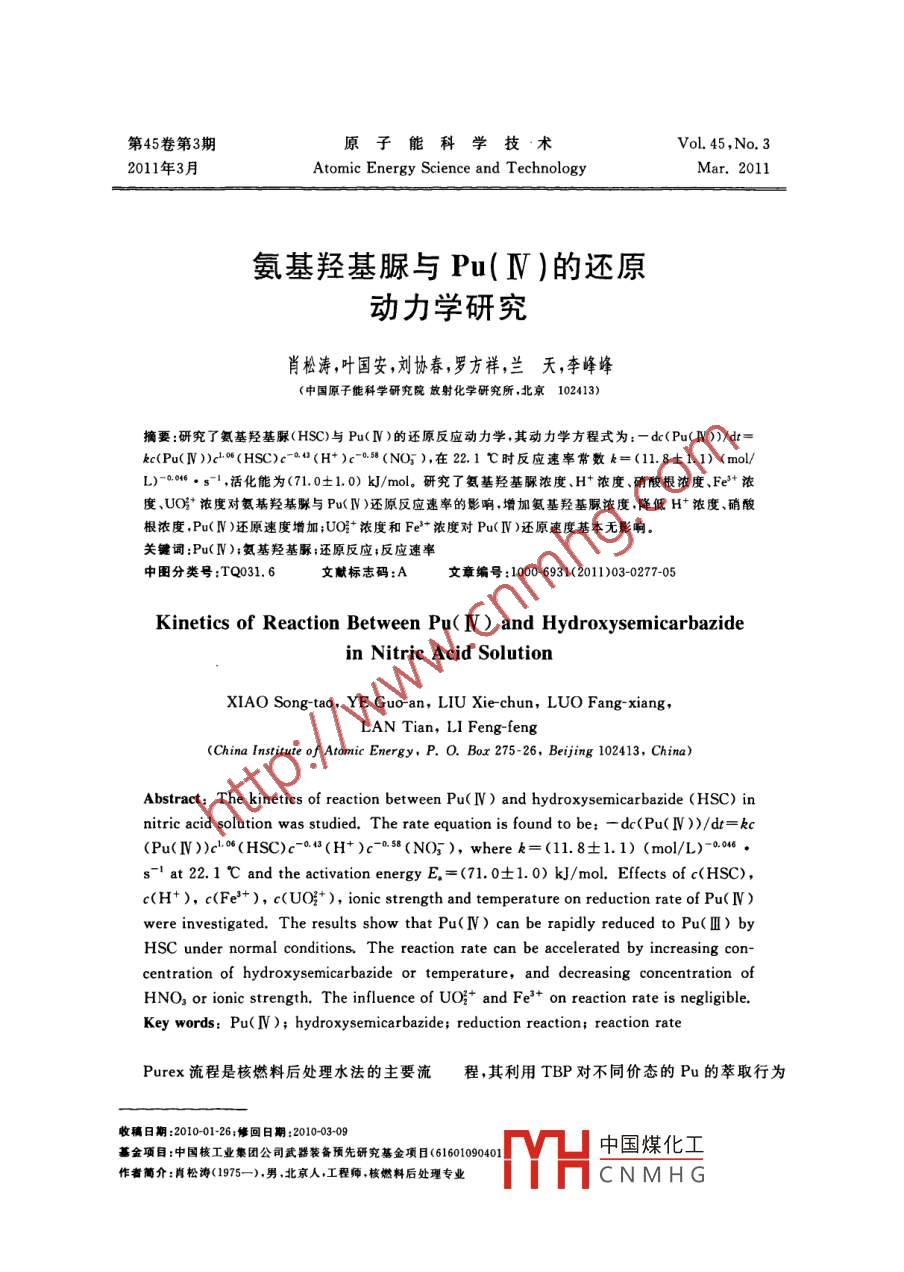氨基羟基脲与Pu(Ⅳ)的还原动力学研究