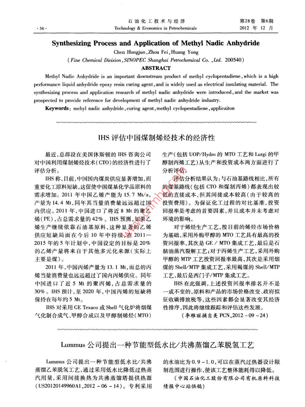 IHS评估中国煤制烯烃技术的经济性