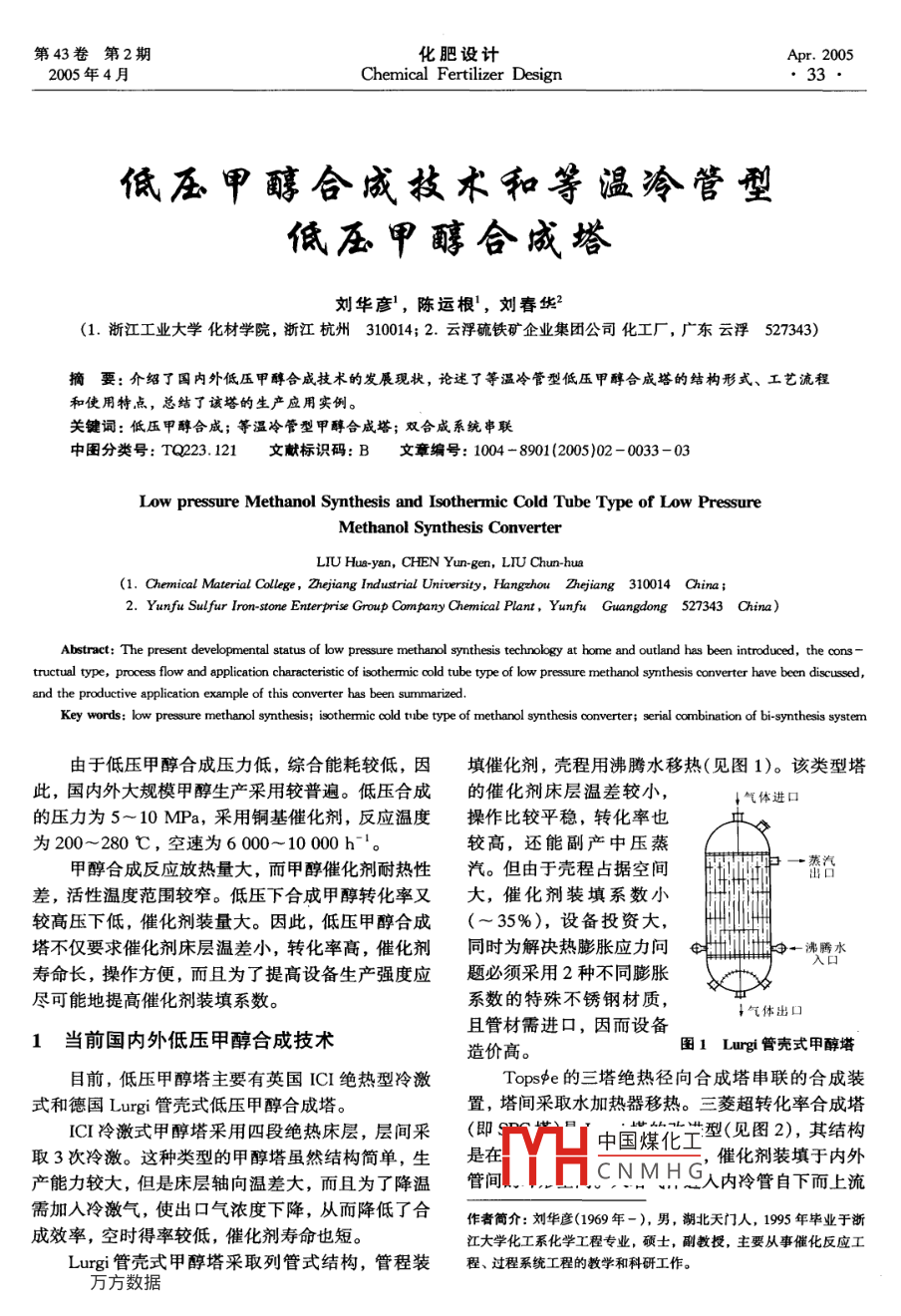 低压甲醇合成技术和等温冷管型低压甲醇合成塔