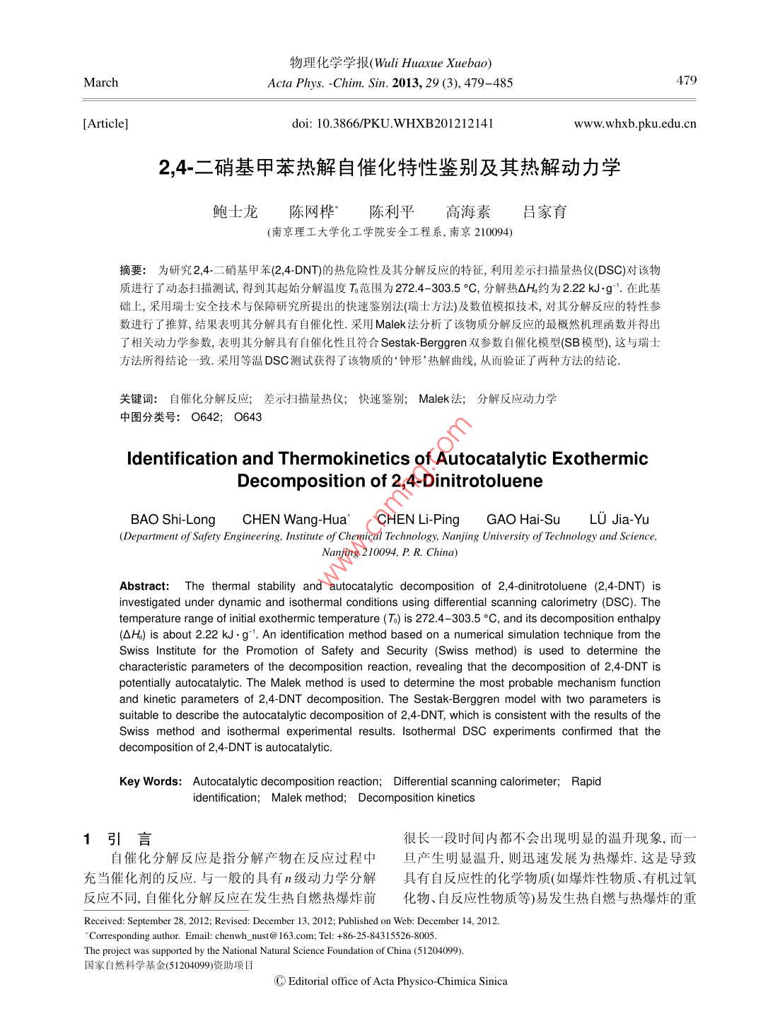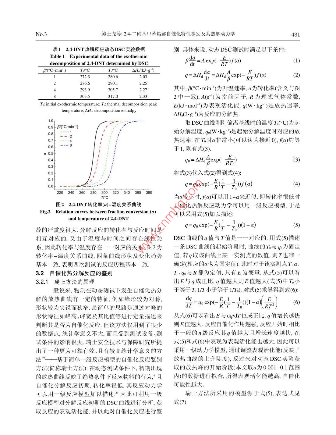 2,4-二硝基甲苯热解自催化特性鉴别及其热解动力学