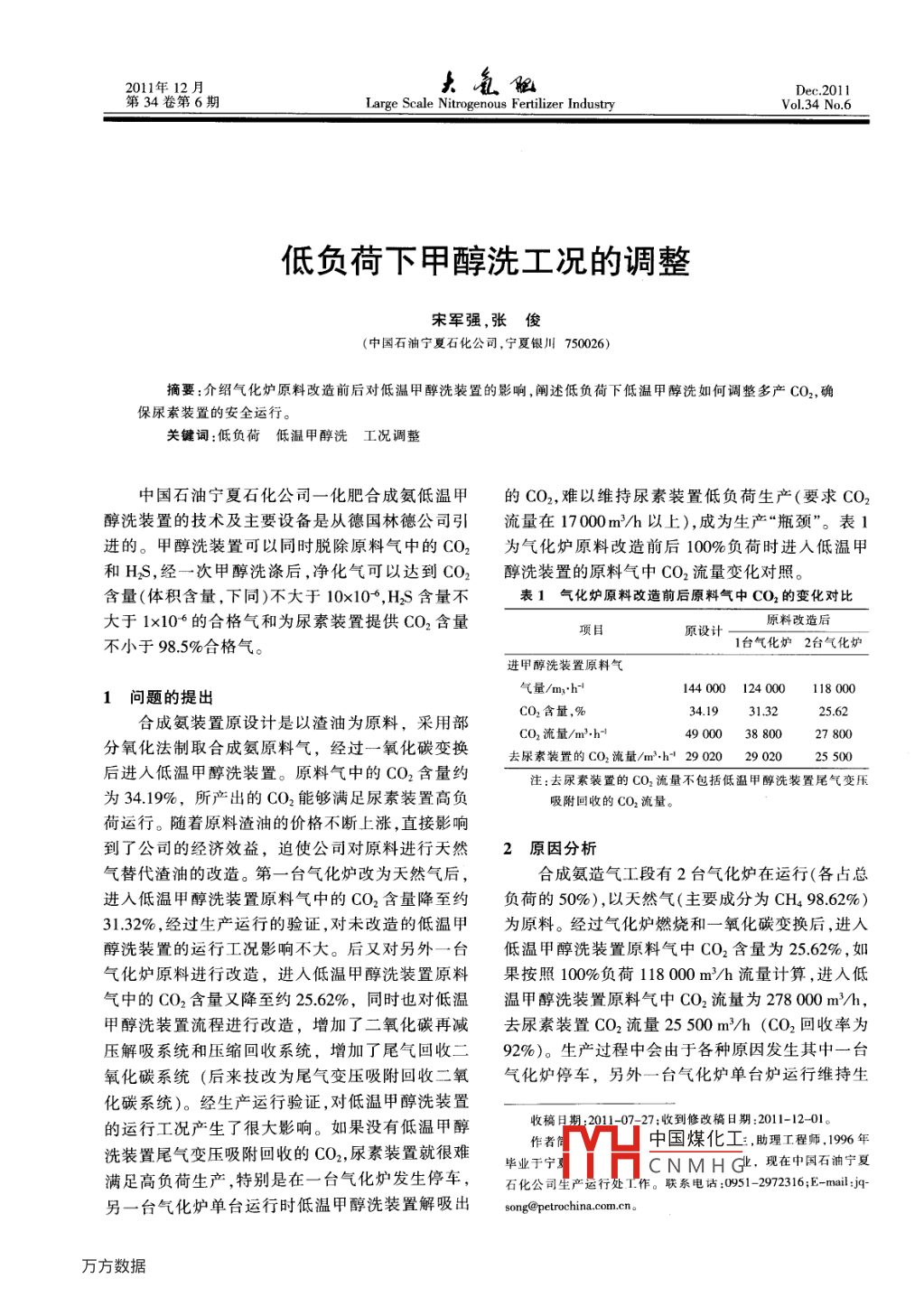 低负荷下甲醇洗工况的调整