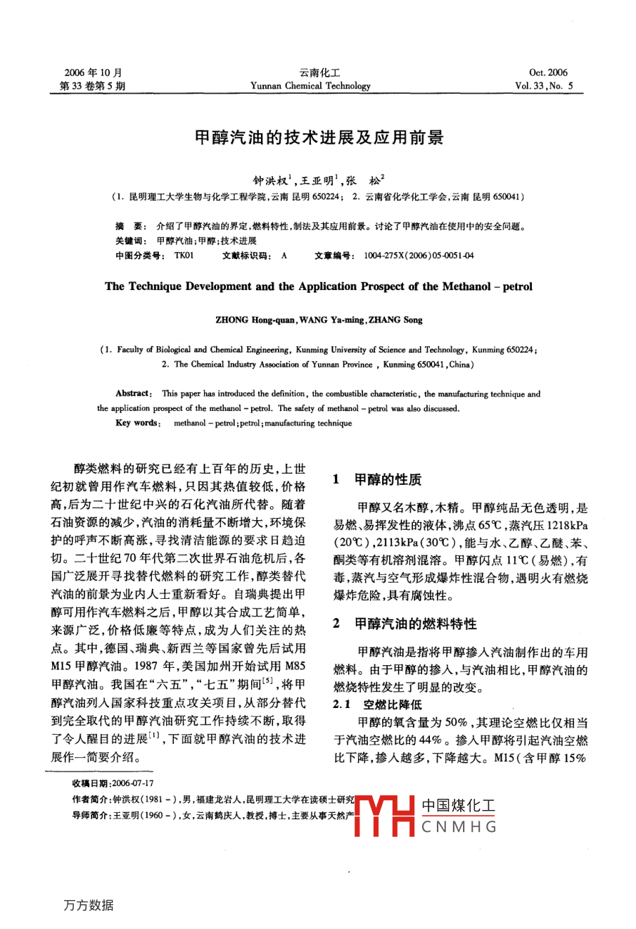 甲醇汽油的技术进展及应用前景