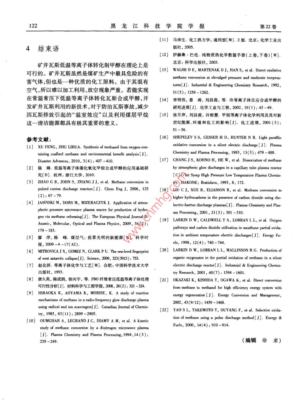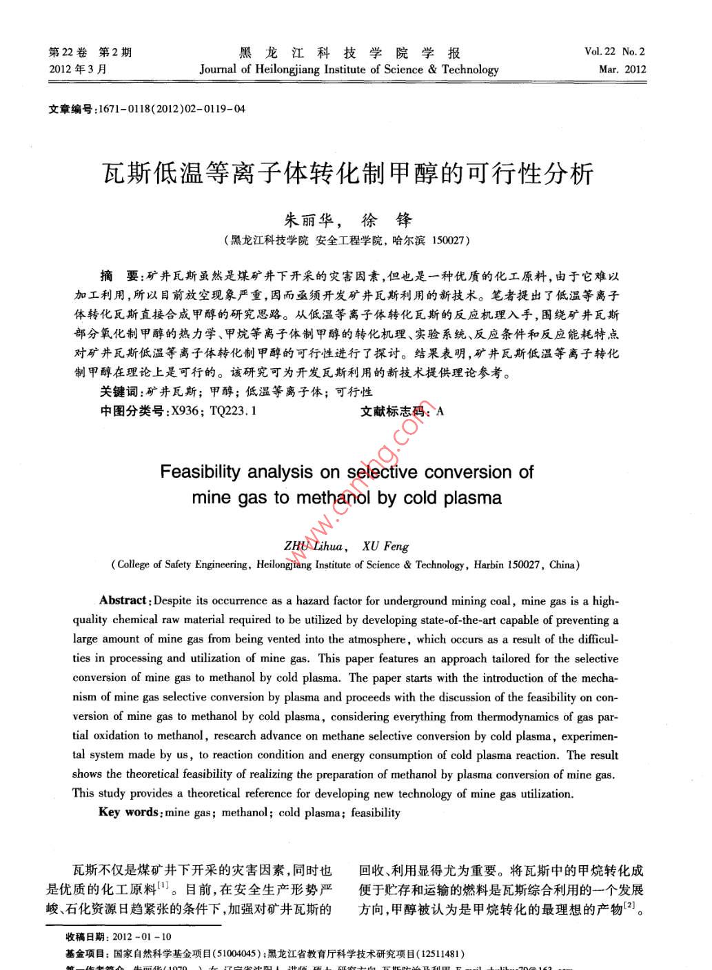 瓦斯低温等离子体转化制甲醇的可行性分析