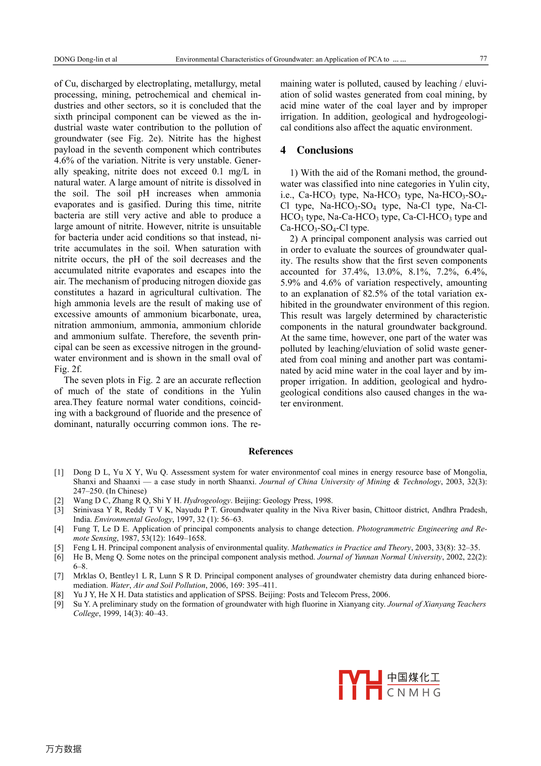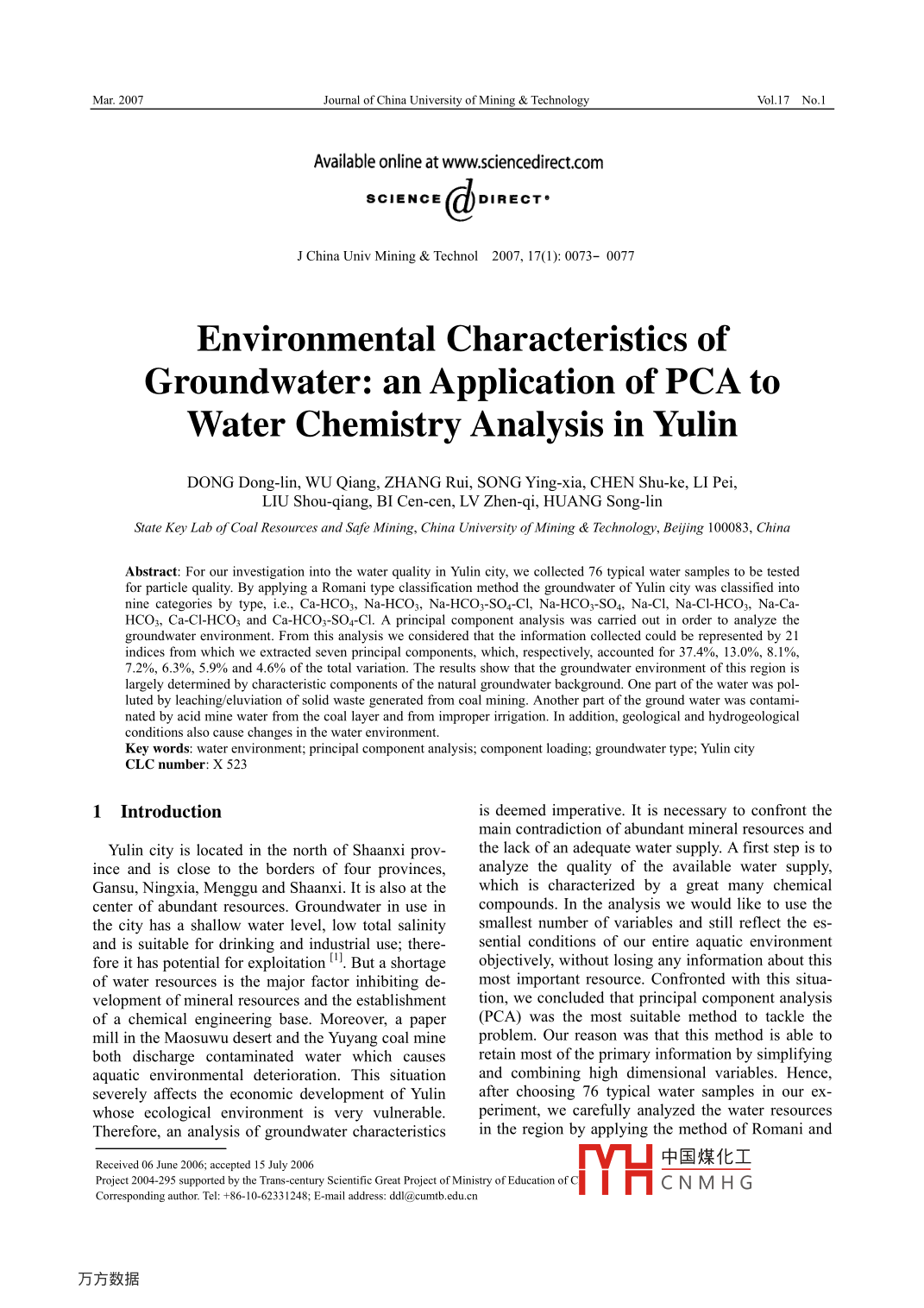 Environmental Characteristics of Groundwater: an Application of PCA to Water Chemistry Analysis in Y Environmental Characteristics of Groundwater: an Application of PCA to Water Chemistry Analysis in Y
