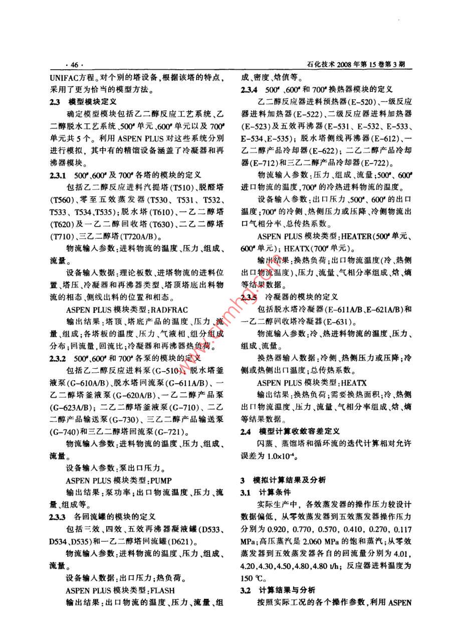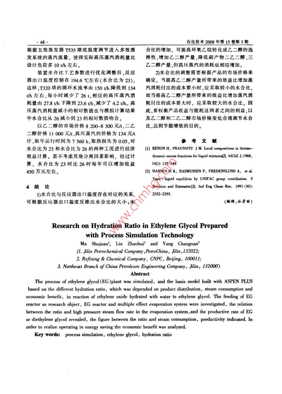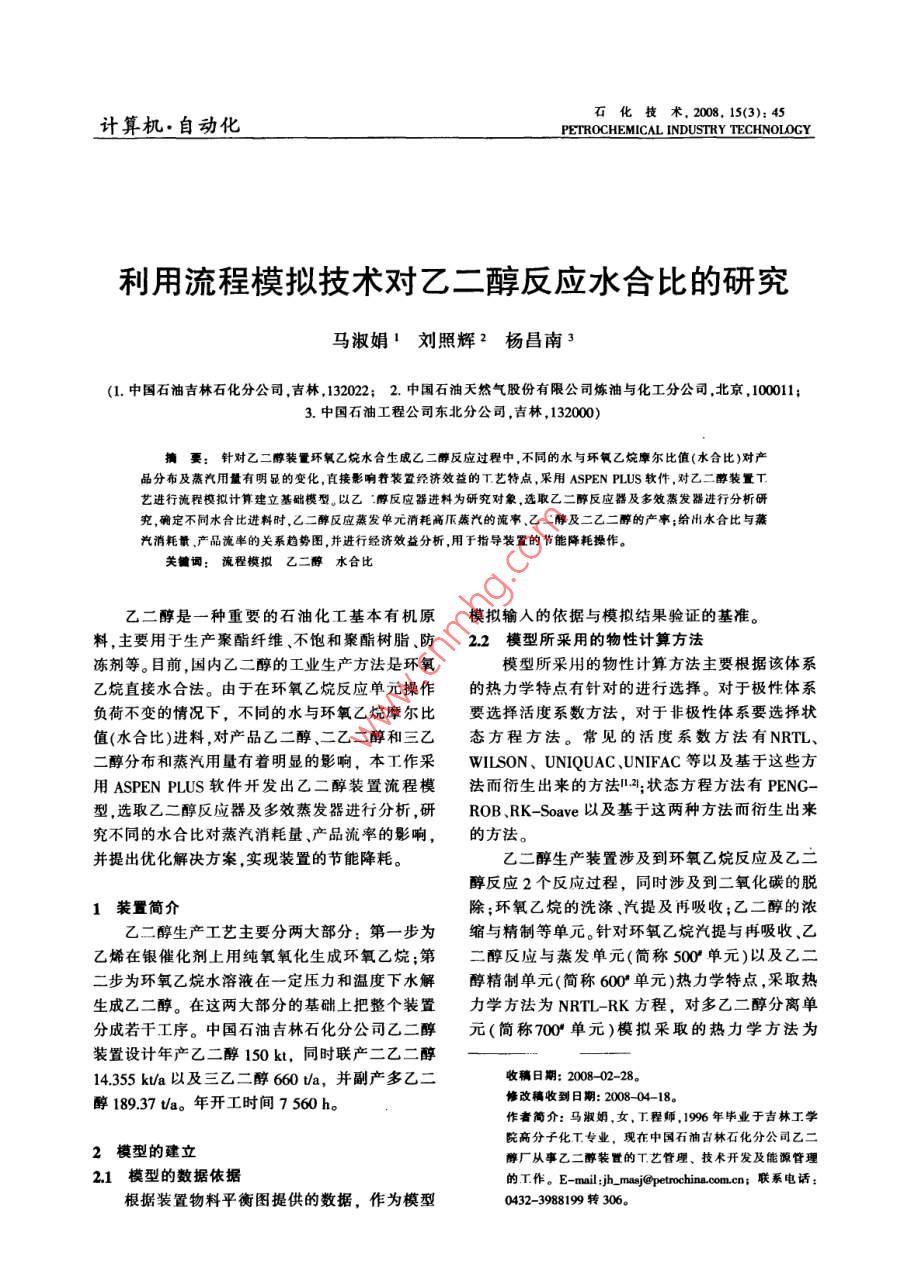 利用流程模拟技术对乙二醇反应水合比的研究