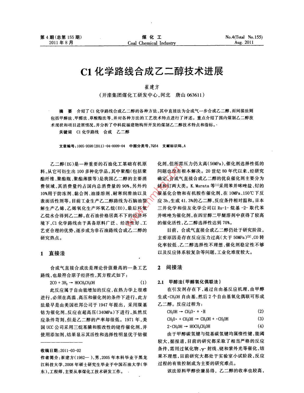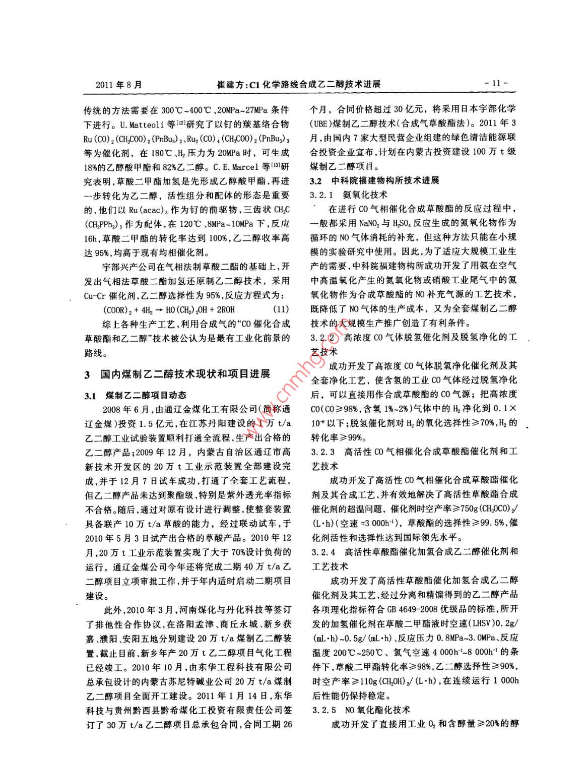 C1化学路线合成乙二醇技术进展