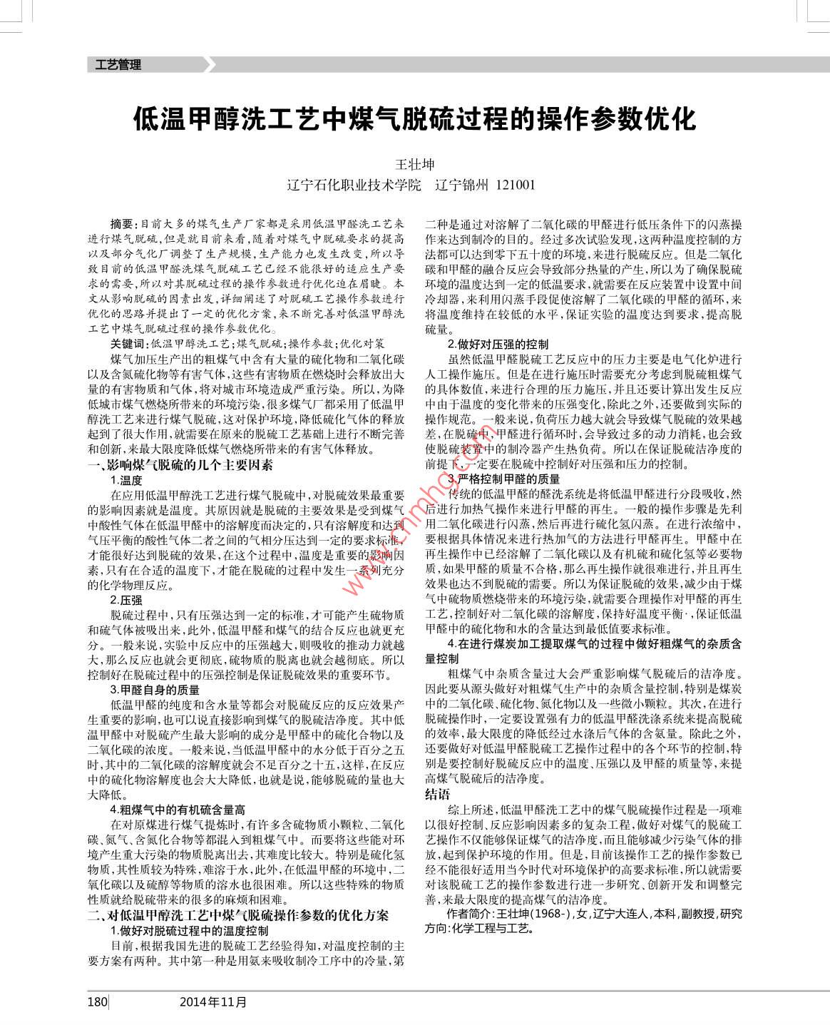 低温甲醇洗工艺中煤气脱硫过程的操作参数优化